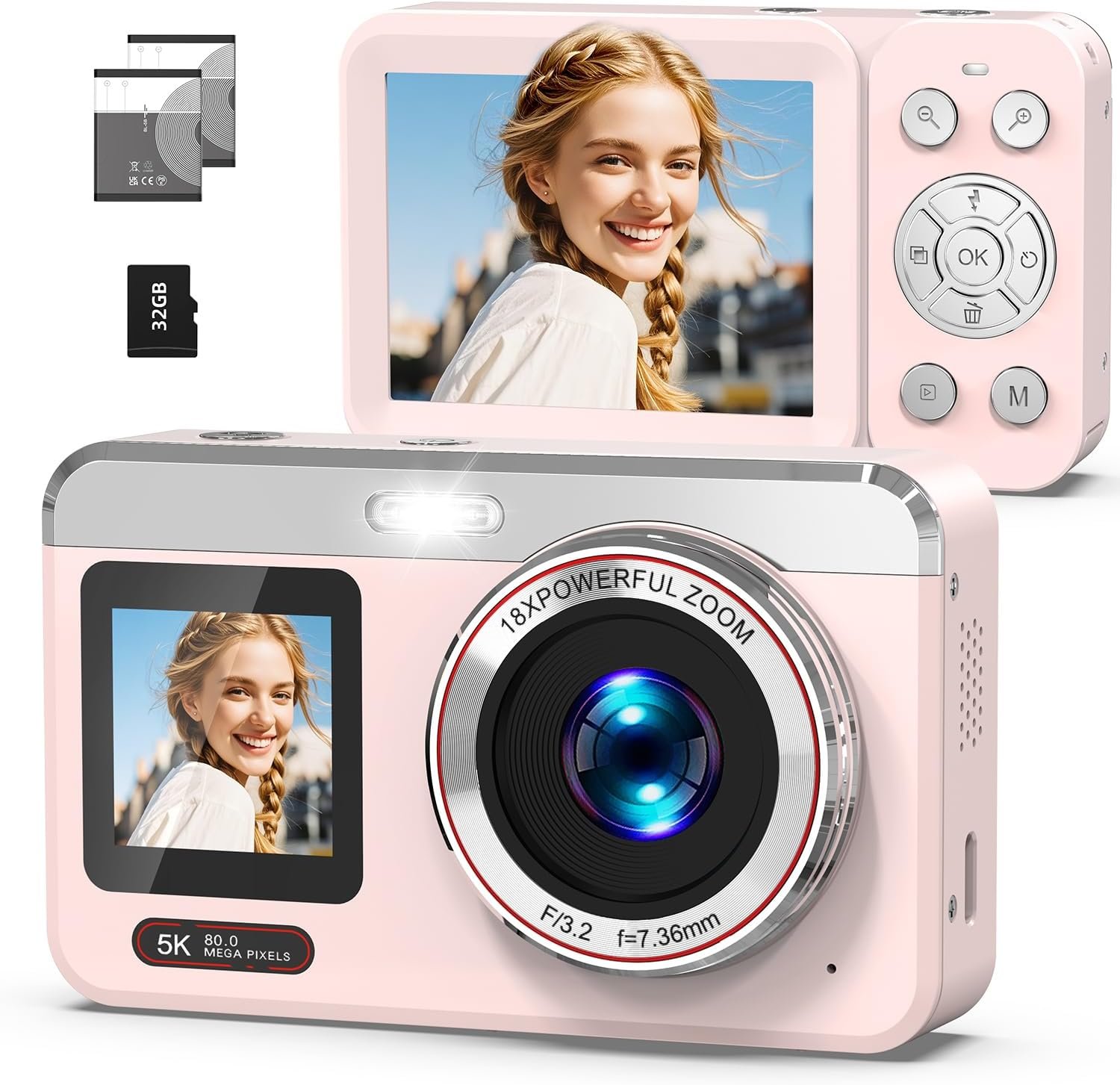 Digital Camera, 5K Vlogging Camera for Photography, 80MP Dual Screen Point and Shoot Digital Camera with Auto Focus, 18X Zoom, Flash, 2 Batteries, 32GB Card for Teens and Adults (Pink)