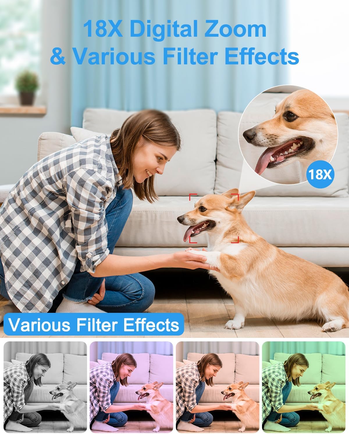 18X Zoom & Creator Modes – One small digital camera, endless creativity. Its 18X digital zoom brings distant scenes-from wildlife to stage moments-into sharp view. Switch between smart scene modes like portrait, night, and beach, or take control with manual ISO/WB, vintage filters, slow-motion, burst shooting, and time-lapse. You can also use it as an HD webcam via USB or transfer files in seconds. This point and shoot camera adapts to your vision, anywhere you create.