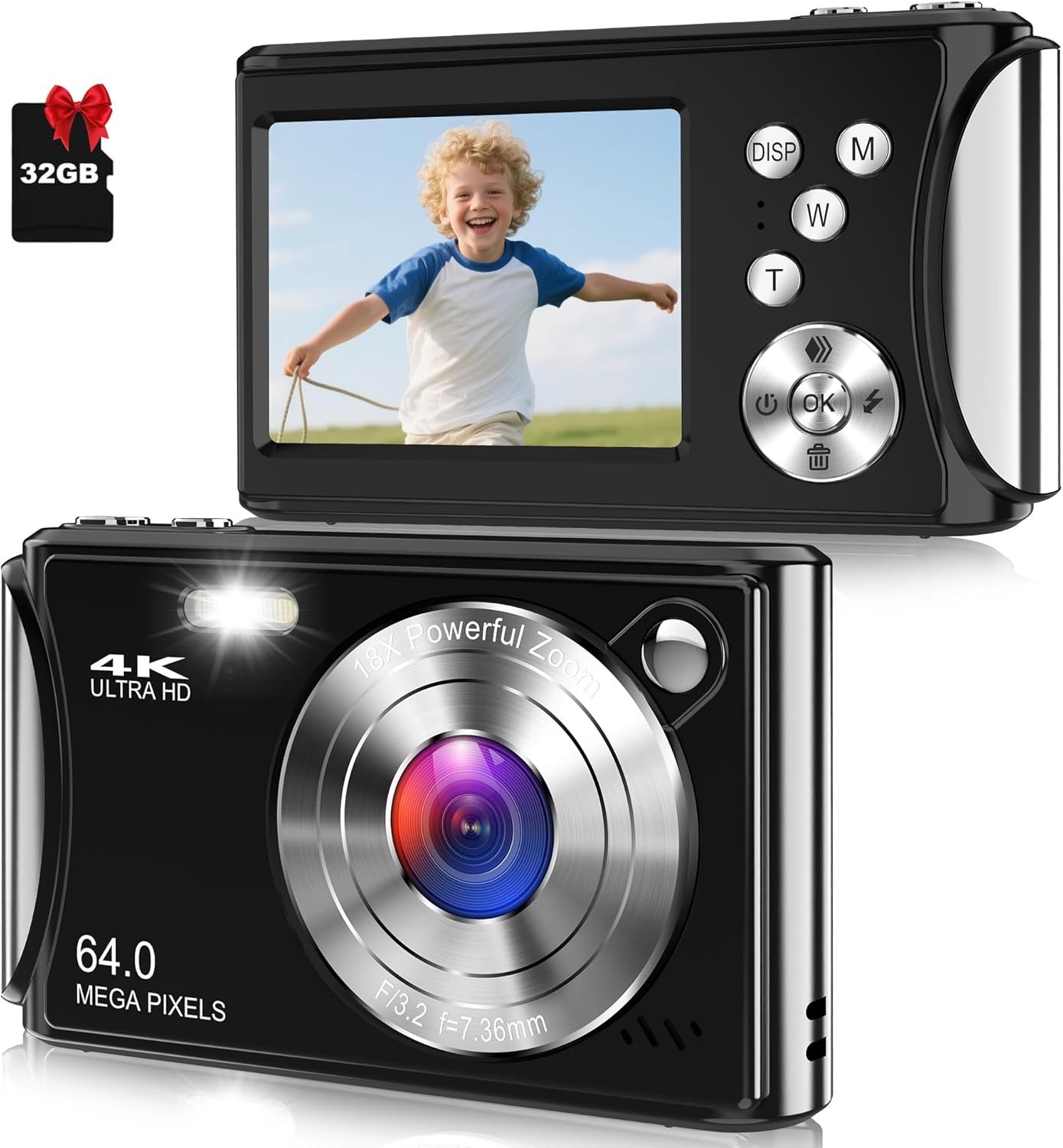 Digital Camera, UHD 4K 64MP Point and Shoot Digital Cameras Compact Camera for Kids with 18X Digital Zoom 32GB SD Card, Anti-Shake with Tripod, Small Gift for Boys Girls Teens Beginner, Black