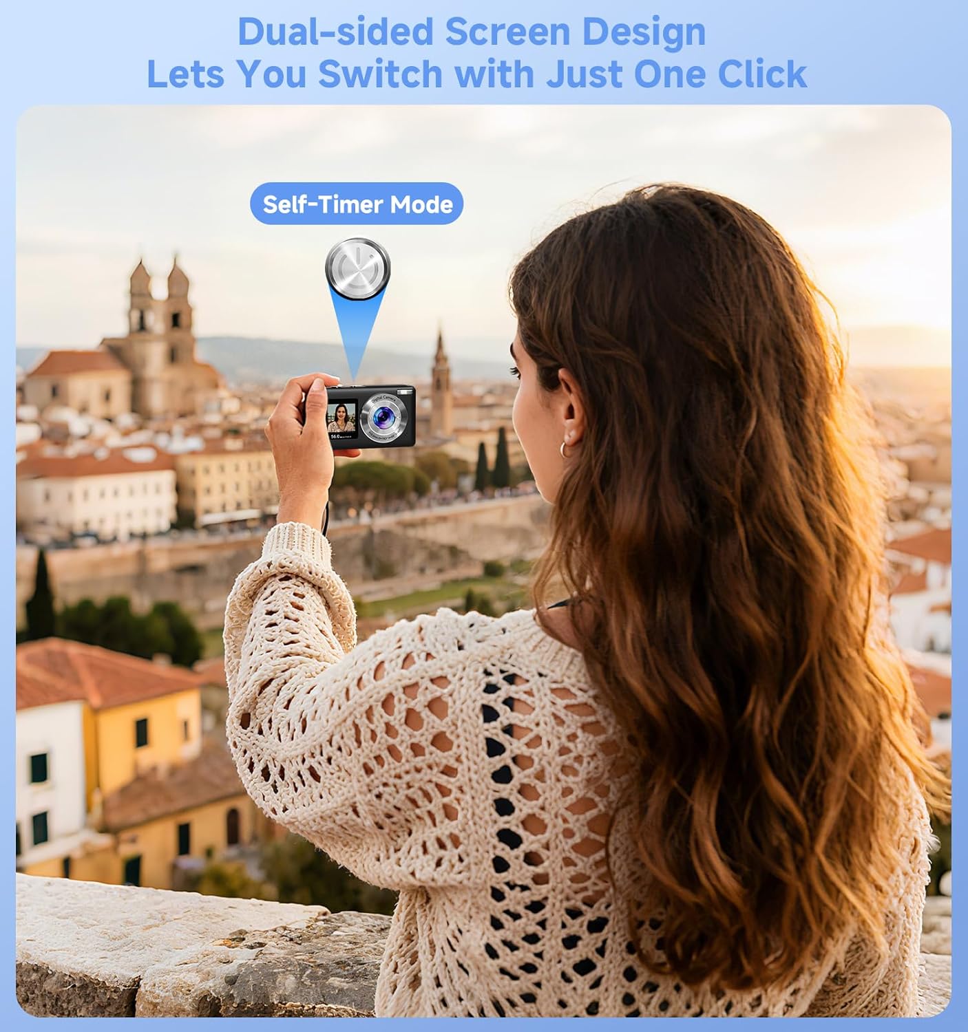 Dual Screens & Anti-Shake: This small digital camera features front and rear dual screens, allowing precise framing for selfies and vlog recordings.Camera for teens with anti-shake, it effectively reduces motion blur during moving shots. Whether for daily moments or outdoor creations, photos and videos stay clear and steady—even beginners can get great results quickly.