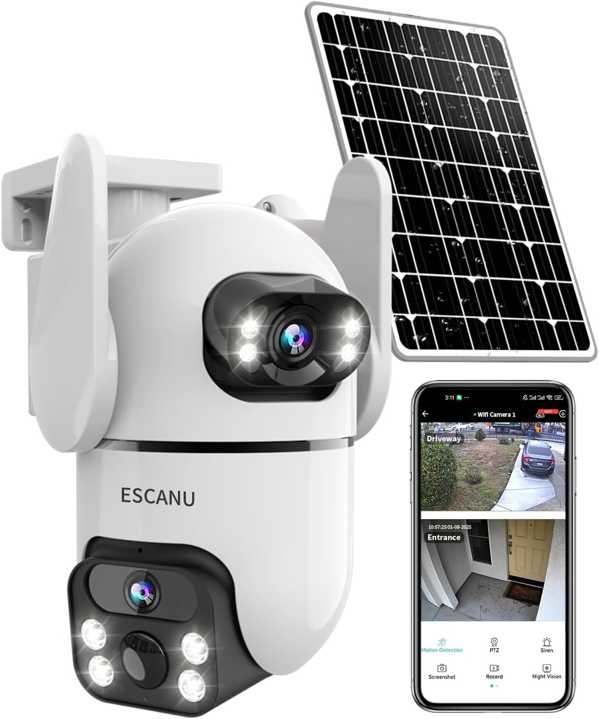 【PTZ and Dual Lens & 360°Coverage】The outdoor PTZ dual lens camera, The fix upper lens monitor the key area, you could mannual adjust the upper lens left right up and down, easy to meet your view angle. The lower lens: supports 330° horizontal rotation and 90° vertical rotation, you could remote rotate camera view angel in your app.No blind spots you could. With 90-degree wide-angle, the ptz camera outdoor guarantees a panoramic shot of every corner of your front door,back yard,shop, garage.