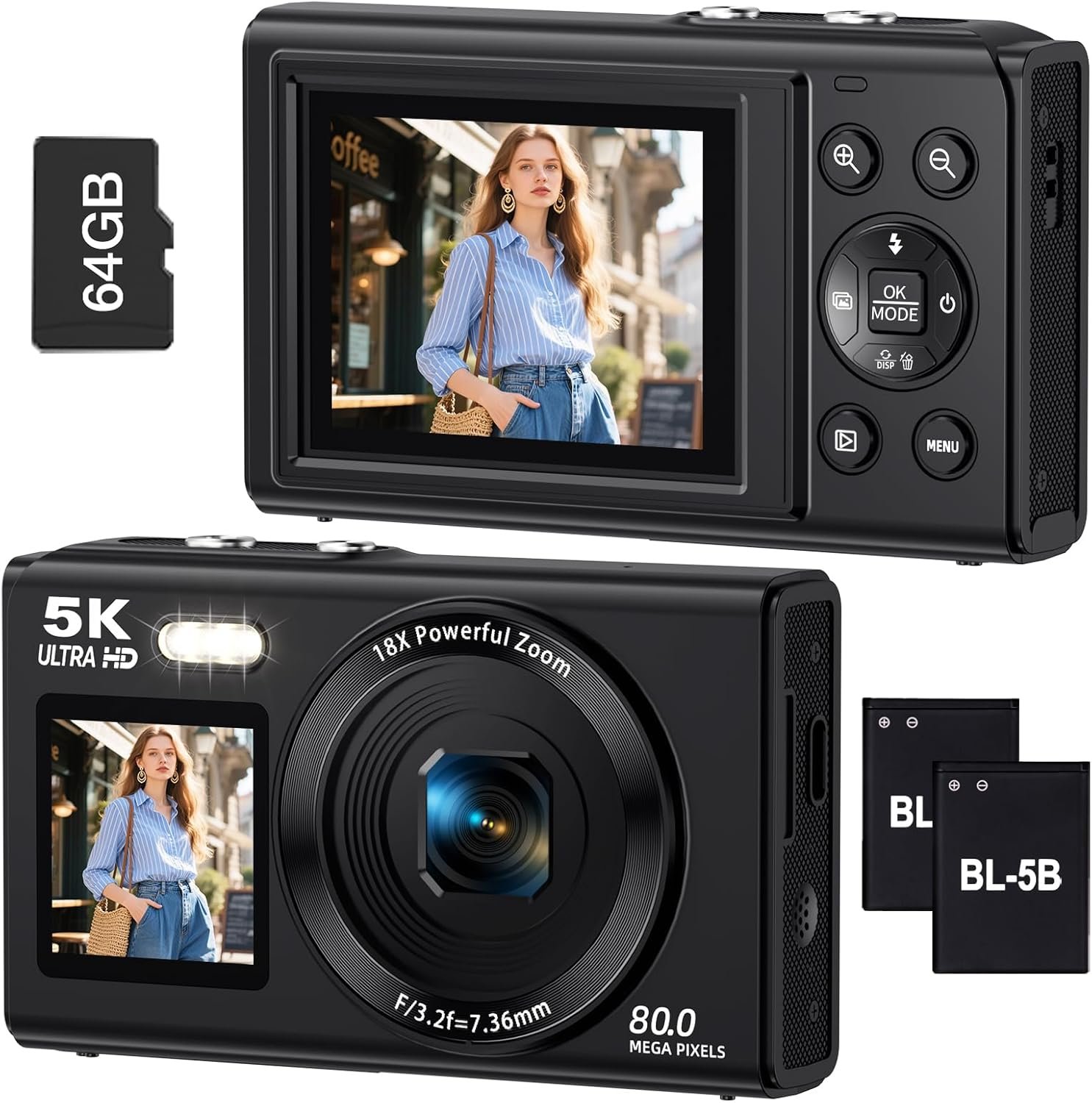 Dual Screen 5K Digital Camera for Vlogging, 80MP WiFi Camera with Front Display, 18X Zoom, Fill Light, Includes 64GB Card & 2 Batteries