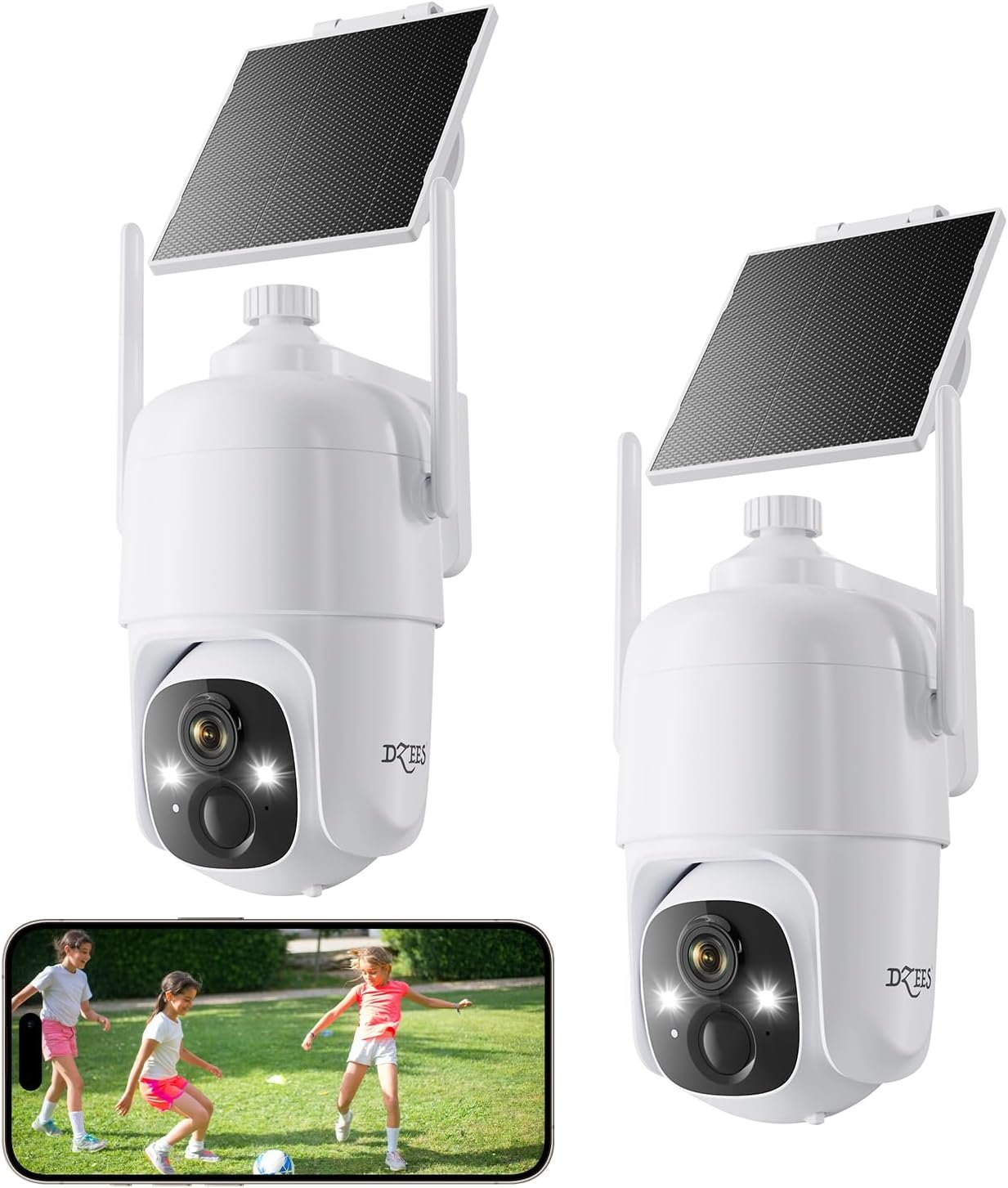 Dzees Solar Security Cameras Wireless Outdoor, 2K Battery Powered Security Camera, 360° PTZ Camera with Spotlight, Siren, Color Night Vision, AI Dectection, IP66 for Home Security, 2.4GHz 2-Pack