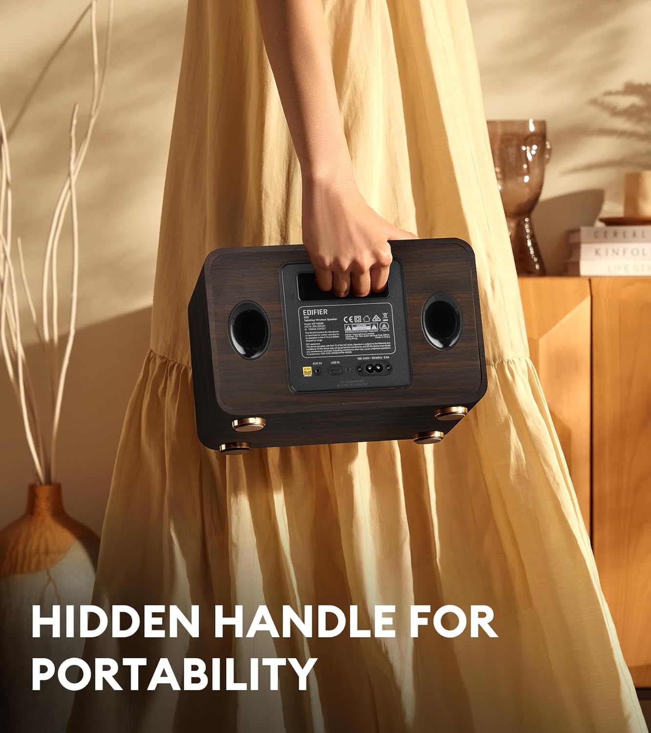 Edifier D32 Tabletop Wireless Speaker, Hi-Res Audio, LDAC, ALAC, 60W (RMS), 2.1 Acoustic Architecture, 11h Playtime, APP Control, Bluetooth 5.3, AirPlay2, USB-C and AUX Inputs, Black Walnut