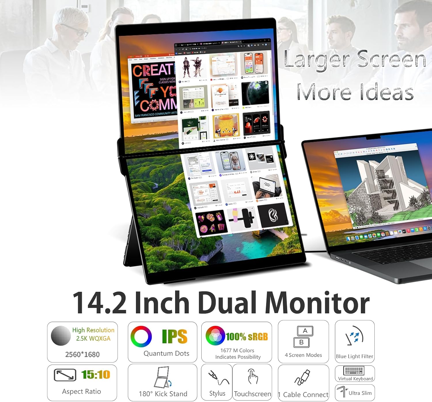 EHOMEWEI X2 Air Touchscreen Portable Dual Monitor 2.8K 90Hz QLED with Stylus Pen 14.2“*2 IPS 2520 * 1680 Display, 400 Nit Brightness 1500:1, 100% sRGB, for Office/Home/Travel Laptop Extender Screen
