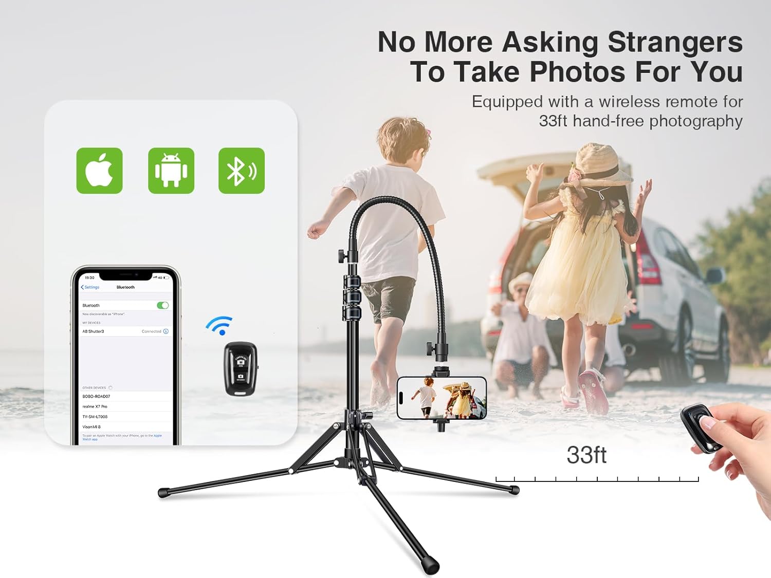 Fit All Cellphones — The phone stand holder can be extended from 2.2 to 4.1 inches, fits all iPhone and Android Cellphone even with a case, such as iPhone 16 Pro Max 16/15/14/13 Pro 12 11 Xs Max Xr X 8 Plus, Samsung Galaxy S21 Ultra S20 Note 20, etc. Equipped with a Bluetooth remote, this iPhone recording stand enables effortless remote photo-taking. It’s perfect for capturing family photos without needing an extra person, and this phone stand tripod offers more than just selfies!