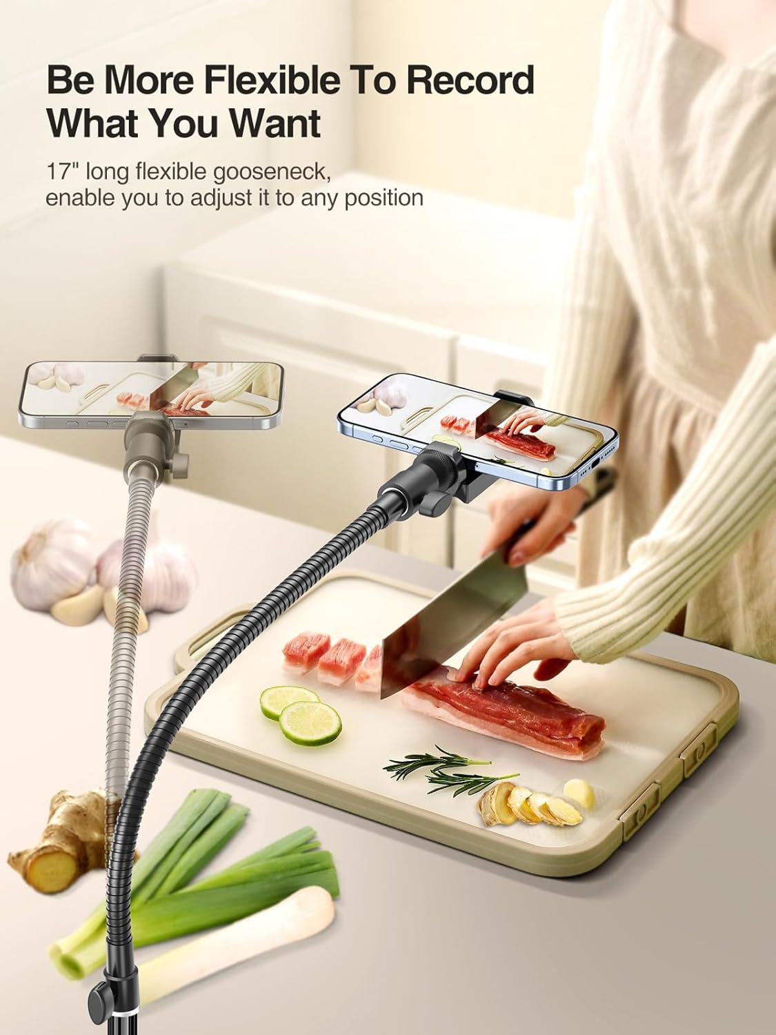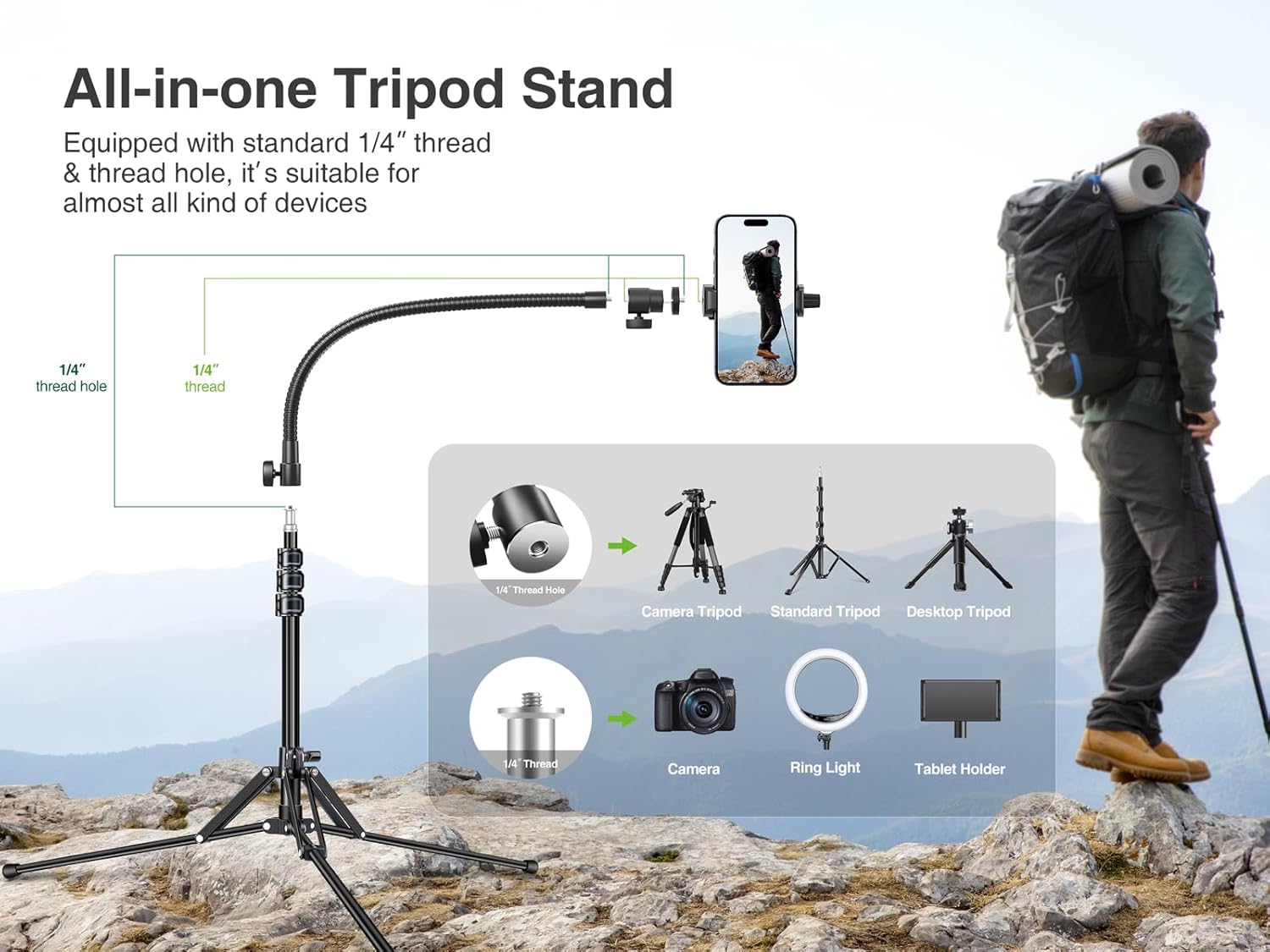 All-in-One Tripod – This gooseneck phone tripod is incredibly versatile: the phone holder, ball head and tripod can all be disassembled into separate units and reassembled with other devices to create a custom stand. The phone holder is universally compatible, fitting any camera/desktop/ring light tripod. You can also mount a tablet holder, ring light, camera or projector on this tripod. The versatility and overall effectiveness make this cell phone tripod a must have.