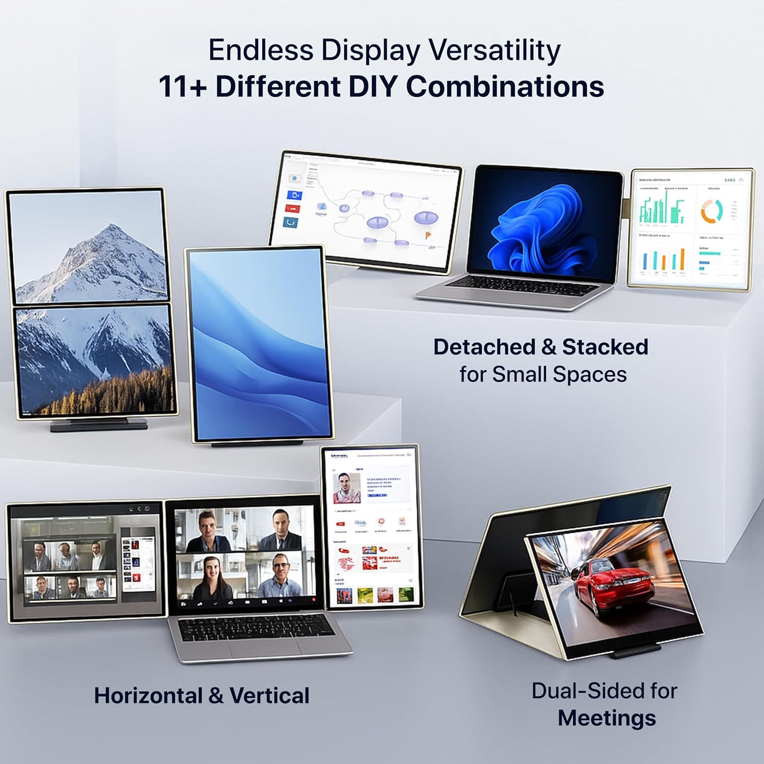 THE MOST VERSATILE DESIGN – Our dual screen monitor for laptop is the newest on the market. Allowing you to adjust, rotate & detach however you want. There are 11+ different combinations to display your screens to your liking. The instruction manual will show you all possible set-ups!