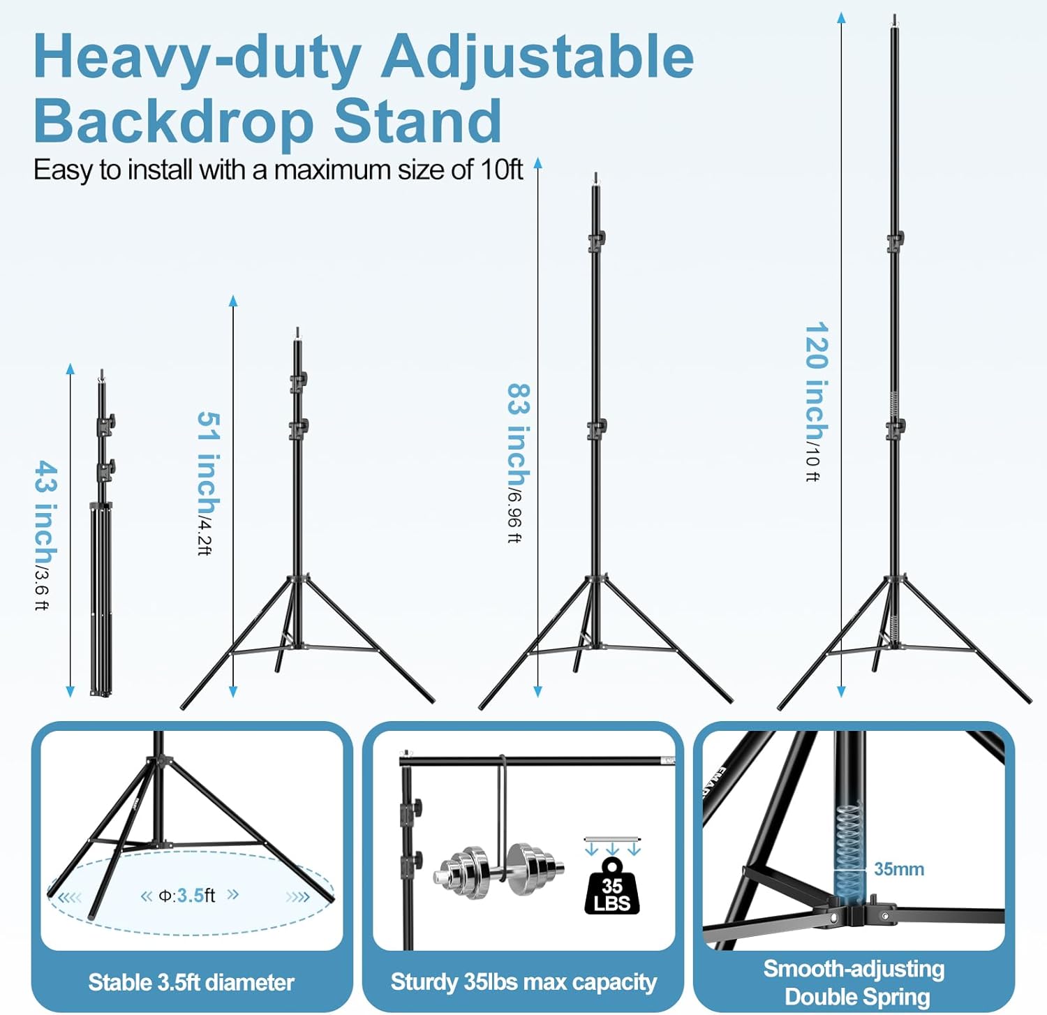 【Heavy Duty Stand Kit】The backdrop stand heavy duty kit containing two adjustable light stands,one telescopic crossbar,four spring clamps,and carrying bag.This complete 10×10 backdrop stand system handles 35lb loads which has professional-grade performance,suitable back drop stand for party,photo booth,video and trade show display.