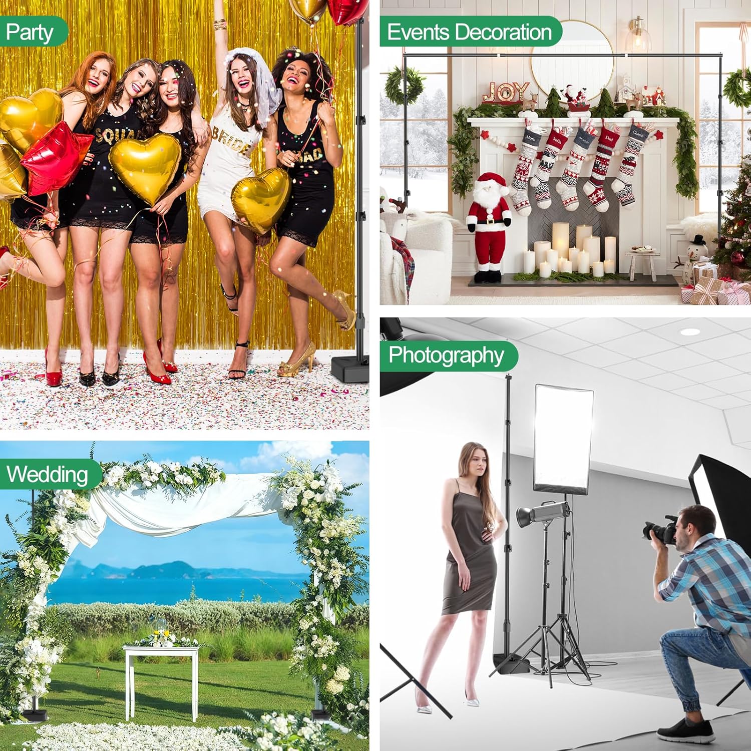 Wide Application:The heavy duty backdrop stand is suitable for a diverse range of scenarios, including wedding, birthday, party, baby shower, family reunion, events decoration, studio photography, commercial display, graduation ceremony and even outdoor shoot