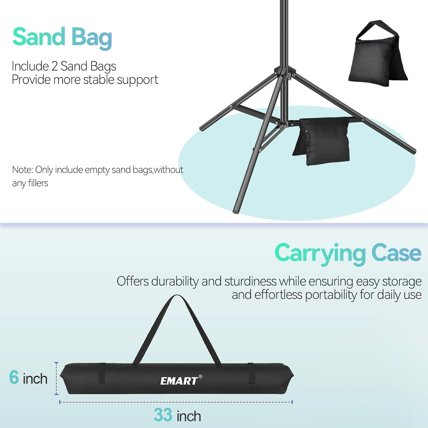 ▶【Clamps & Sandbags】: Matching clips can prevent the backgrop from slipping and reduce creases for better shots. Sandbags can better stabilize the background frame.(NOTE: this bag comes empty, please filled with gravel, or any other material to add weight and the maximum capacity is 11 LBS.)