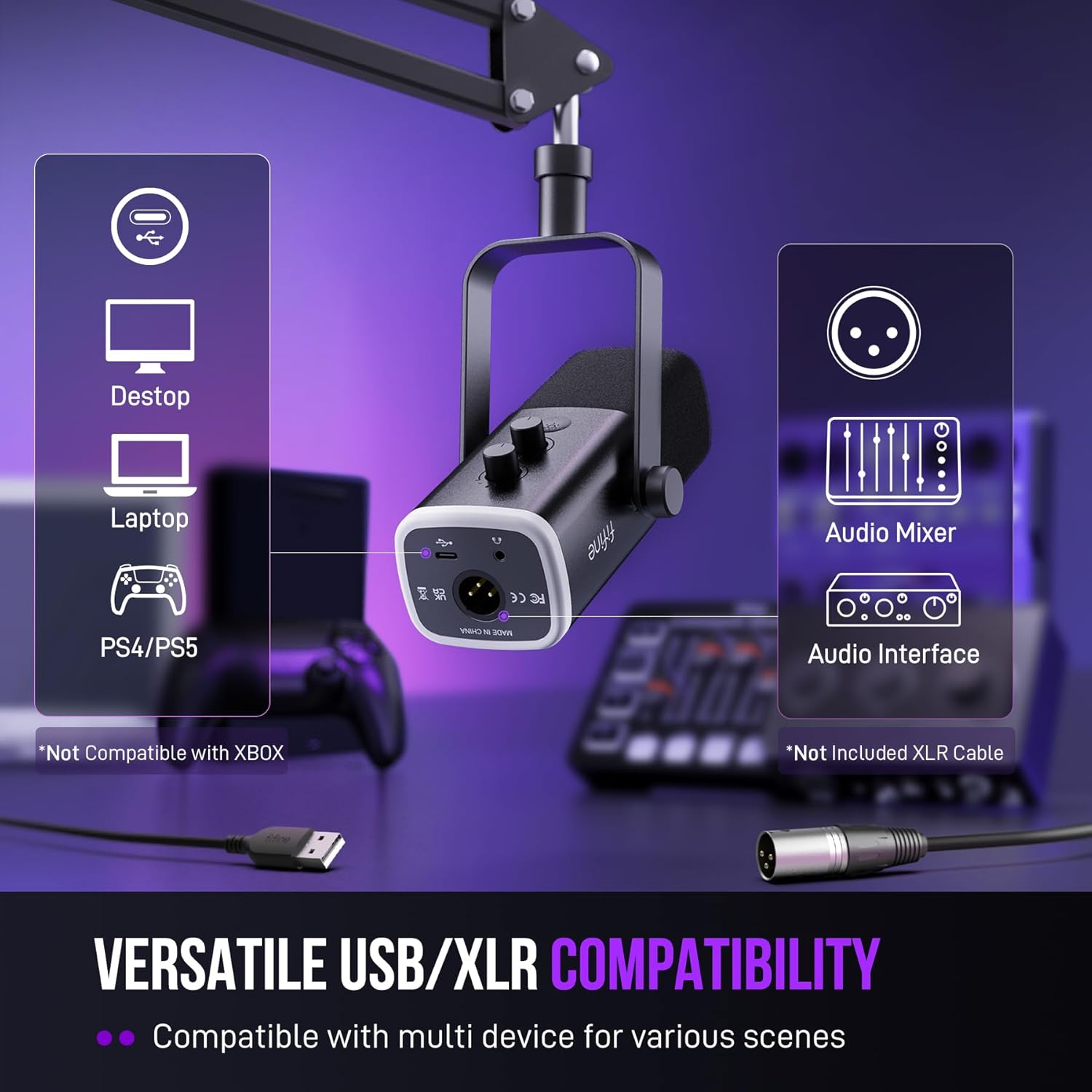 USB/XLR Connectivity-AM8T comes with a dynamic microphone and a boom arm stand. Versatile PC gaming microphone kit with USB compatibility plug and play for PC in streaming or recording, without additional drivers. And also, while in XLR compatibility for mixer or sound card connection, the XLR studio vocal microphone is good at vocal, podcast, or musical instruments creation.