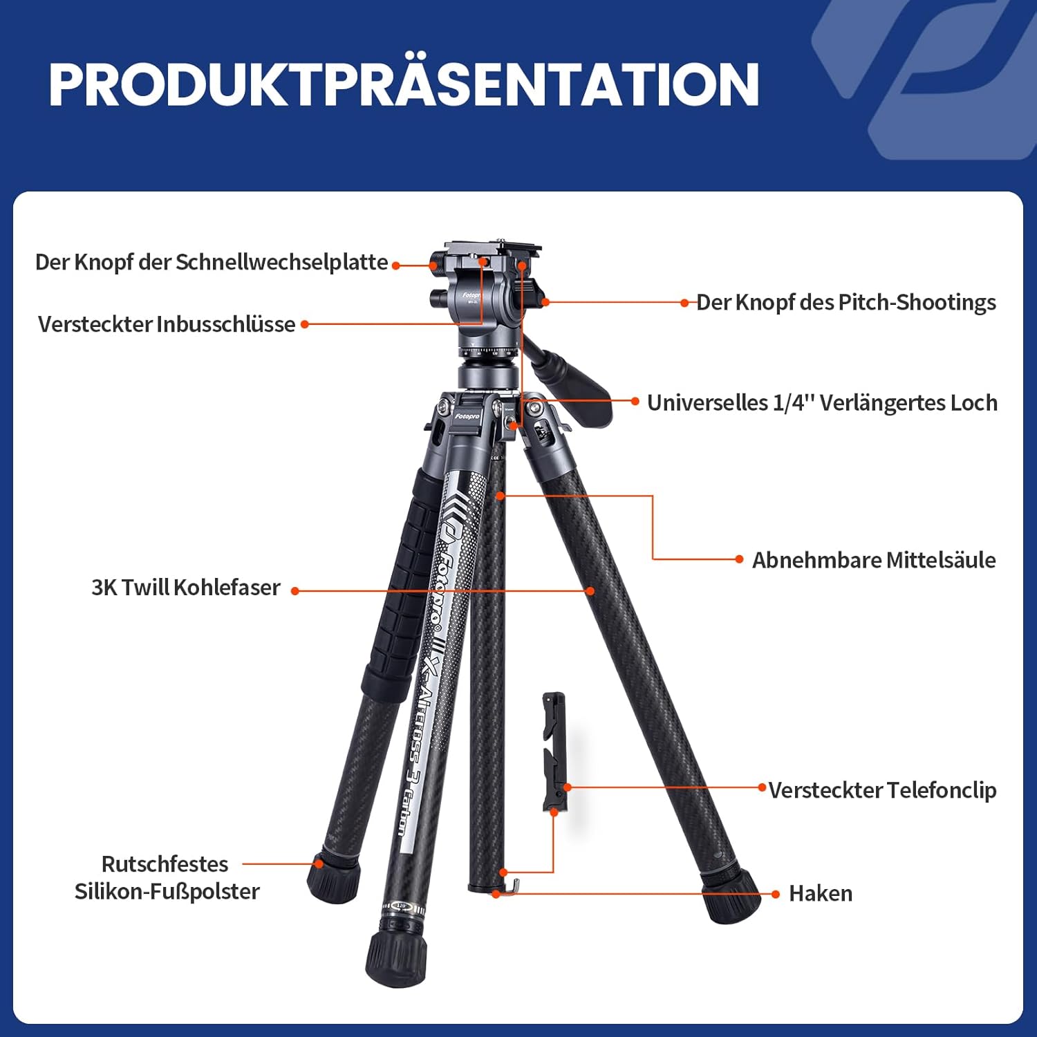 INNOVATIVE LOCKING SYSTEM: Fotopro X-Aircross 3 Lite Video lightweight travel camera tripod foot tube is equipped with quick locking patented system, which can extend the tripod in a second and quickly capture the wonderful moments, never loosen even dragged.