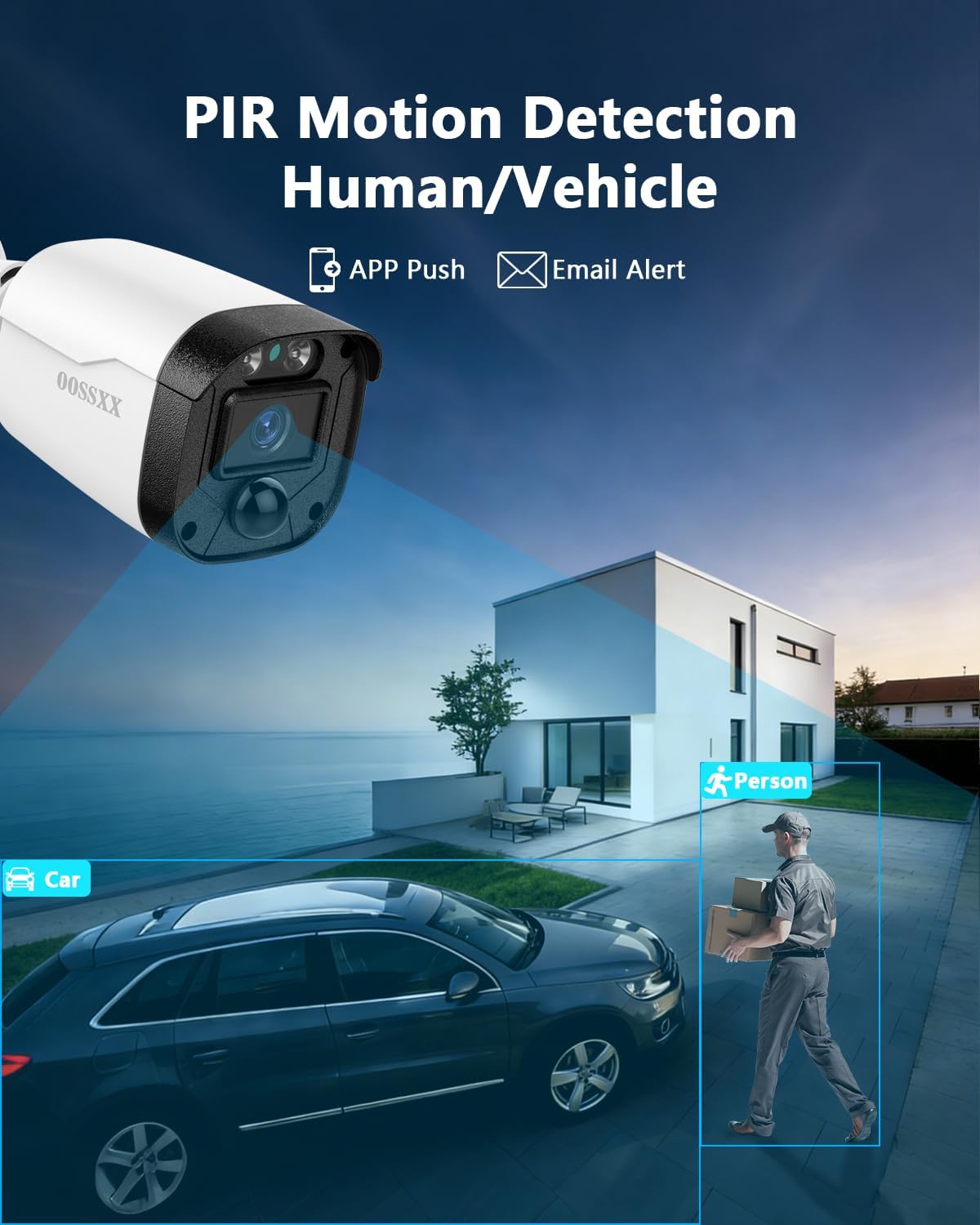 {Super Night Vision} Embrace a new era of clarity with the OOSSXX outdoor cameras. Equipped with a high-resolution 5MP sensor and an IR cut filter, this security camera deliver unmatched visuals day and night. Enjoy a 80ft night vision range and an expansive 130° viewing angle, ensuring comprehensive coverage around the clock.