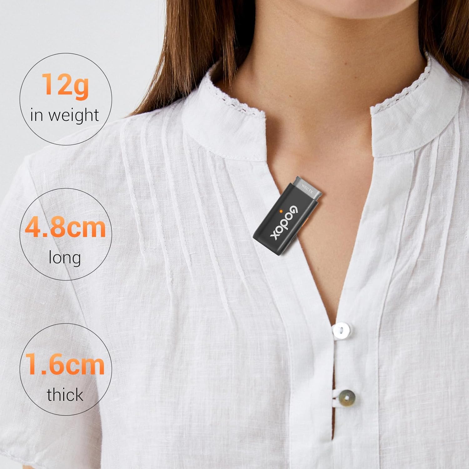 【Incredible Lightweight and Compact】GODOX WEC wireless microphones TX weighs only 0.42oz/12g, lighter than 3pcs of A4 papers, RX weighs only 0.56oz/16g, None-feeling wear experience.
