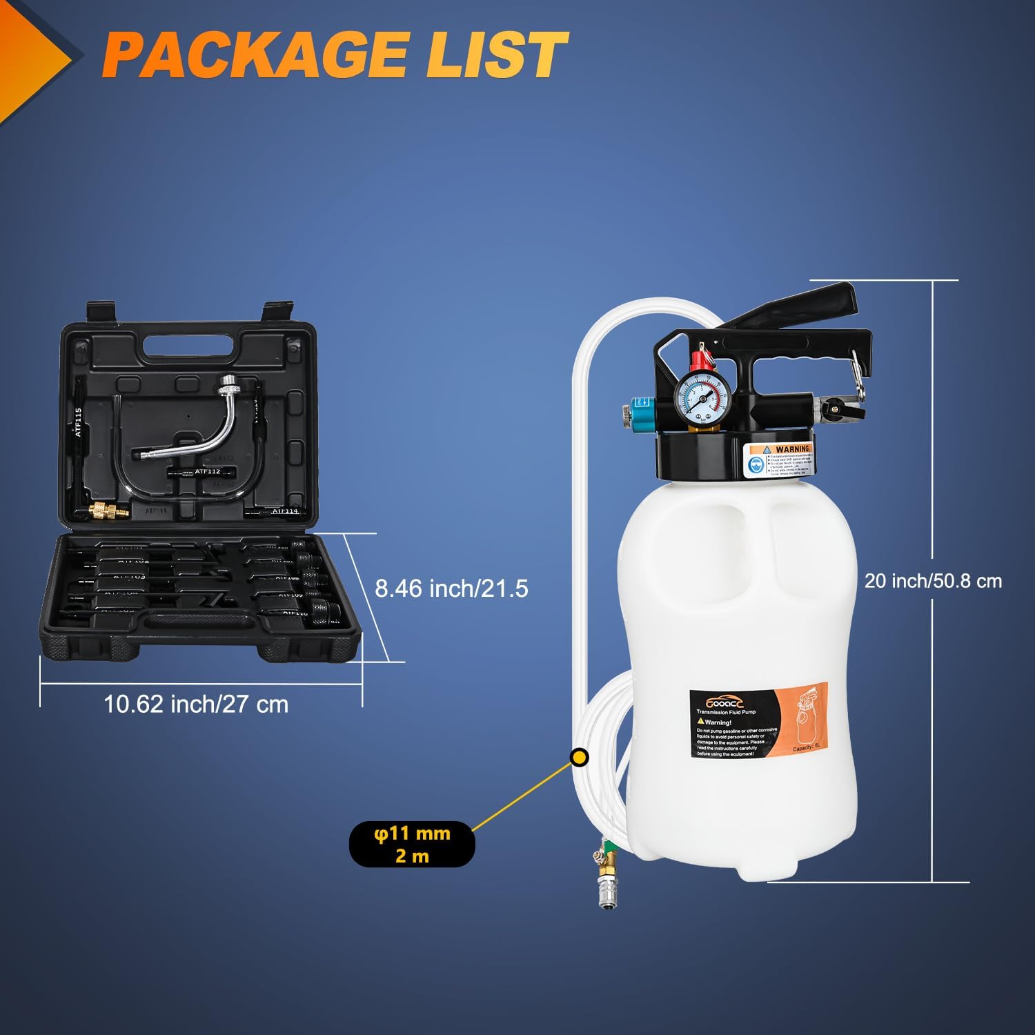SET INCLUDES: 1 x 10L (2.6 Gal) Transmission fluid transfer pump, 1 x 15 ATF filler adapters with a toolbox, 3 x hoses. If you have any problem with your product, please feel free to contact us, we will try our best to help you solve the problem