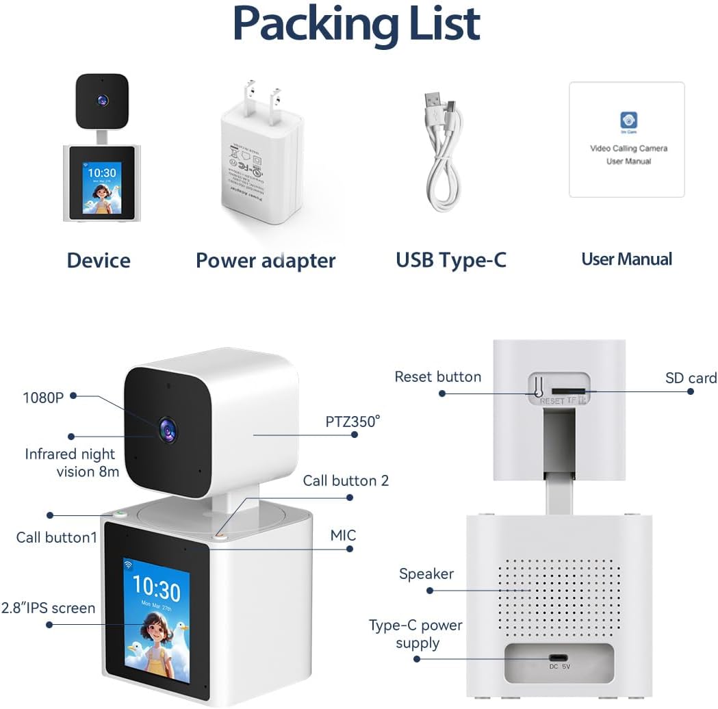 CPU Dual core processor LCD IPS 2.8″ HD Screen Video Resolution 1920*1080 HD Lens 120° WideAngle, 1/2.8”CMOS,20FPS Night vision Distance 8M Audio Analog Single MlC, Pickup Distance :8M PTZ Rotation 350° horizontally, 60° vertically Network 2.4Ghz Wi-Fi Al Feature Motion detection Voice Control Non Intelligent Alarm Message Push Service Support Cloud Storage TF card Slot Support TF card, max 128GB Power plug Type-C, DC 5V/2A Reset Key Support Certification CE, FCC,ROHS, UKCA,GB4943
