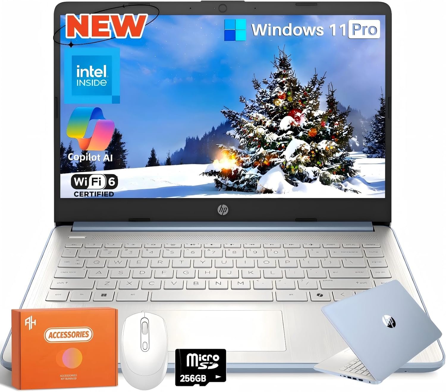 HP 14 Inch Laptop Computer Student Business, Intel Processor N150, 4GB RAM, 384GB Storage(128GB UFS+256GB MSD), Copilot AI, 1-Yr Office 365, Wi-Fi 6, Ultra Light, Windows 11 Pro, Sky Blue, W/Mouse