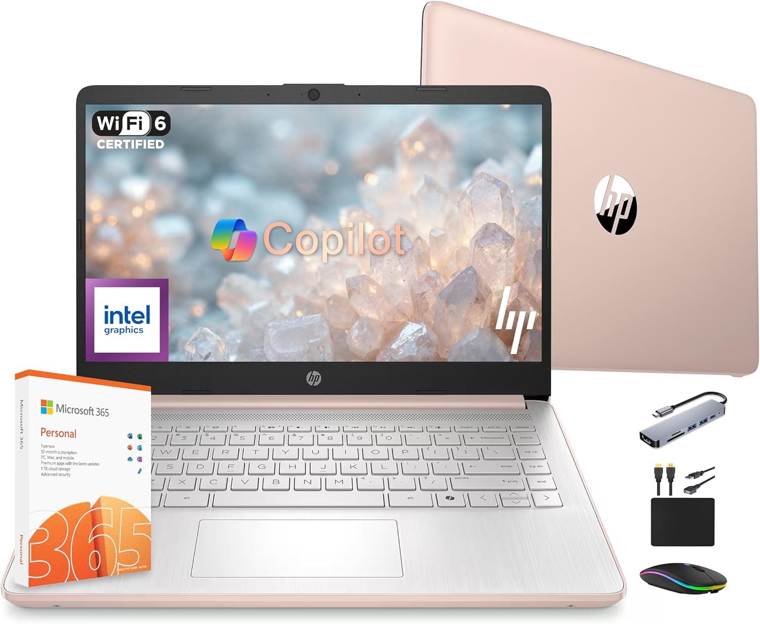 HP 14 Laptop Computer 2025 Ultra Light, AI Copilot Student Business, Quad-Core Intel, 16GB RAM, 628GB Storage (128GB UFS+ 500GB Ext), 1 Yr Office 365, 12 Hr Battery MarxsolAccessory Win 11S, Rose Gold