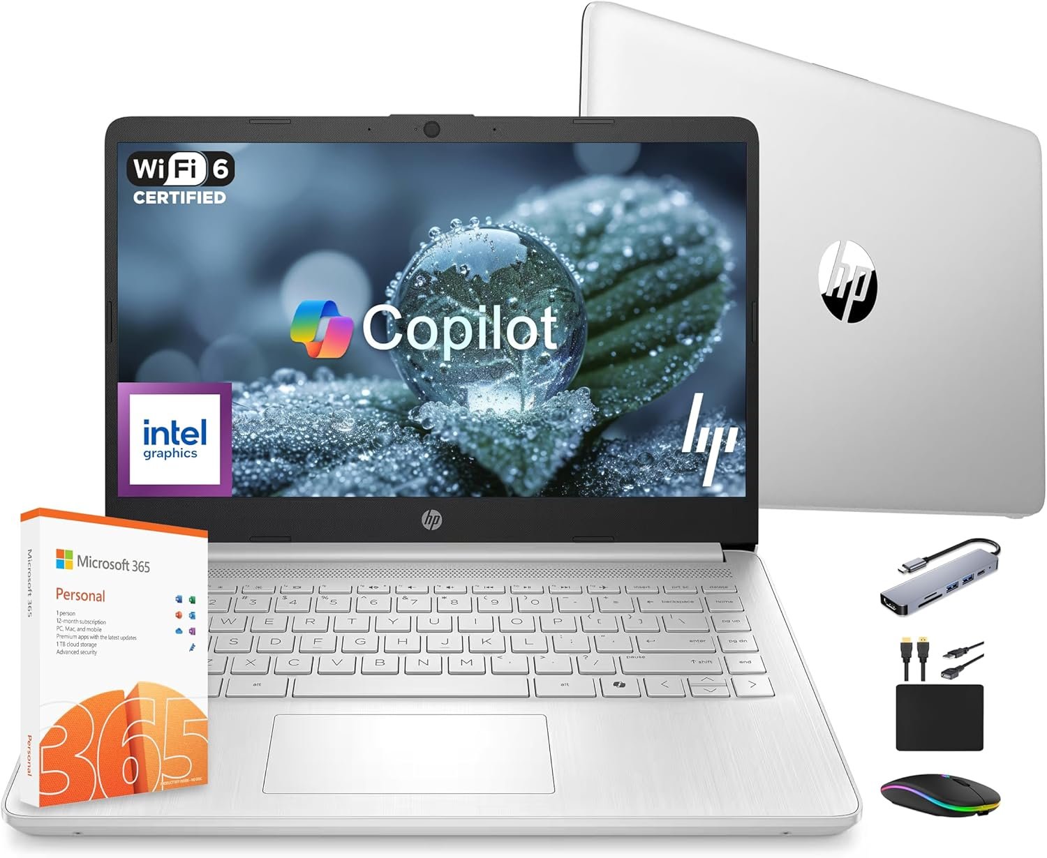 HP 14 Laptop Computer 2025 Ultra Light, AI Copilot Student Business, Quad-Core Intel, 16GB RAM, 628GB Storage (128GB UFS+ 500GB Ext), 1 Yr Office 365, 12 Hr Battery MarxsolAccessory Win 11S, Silver