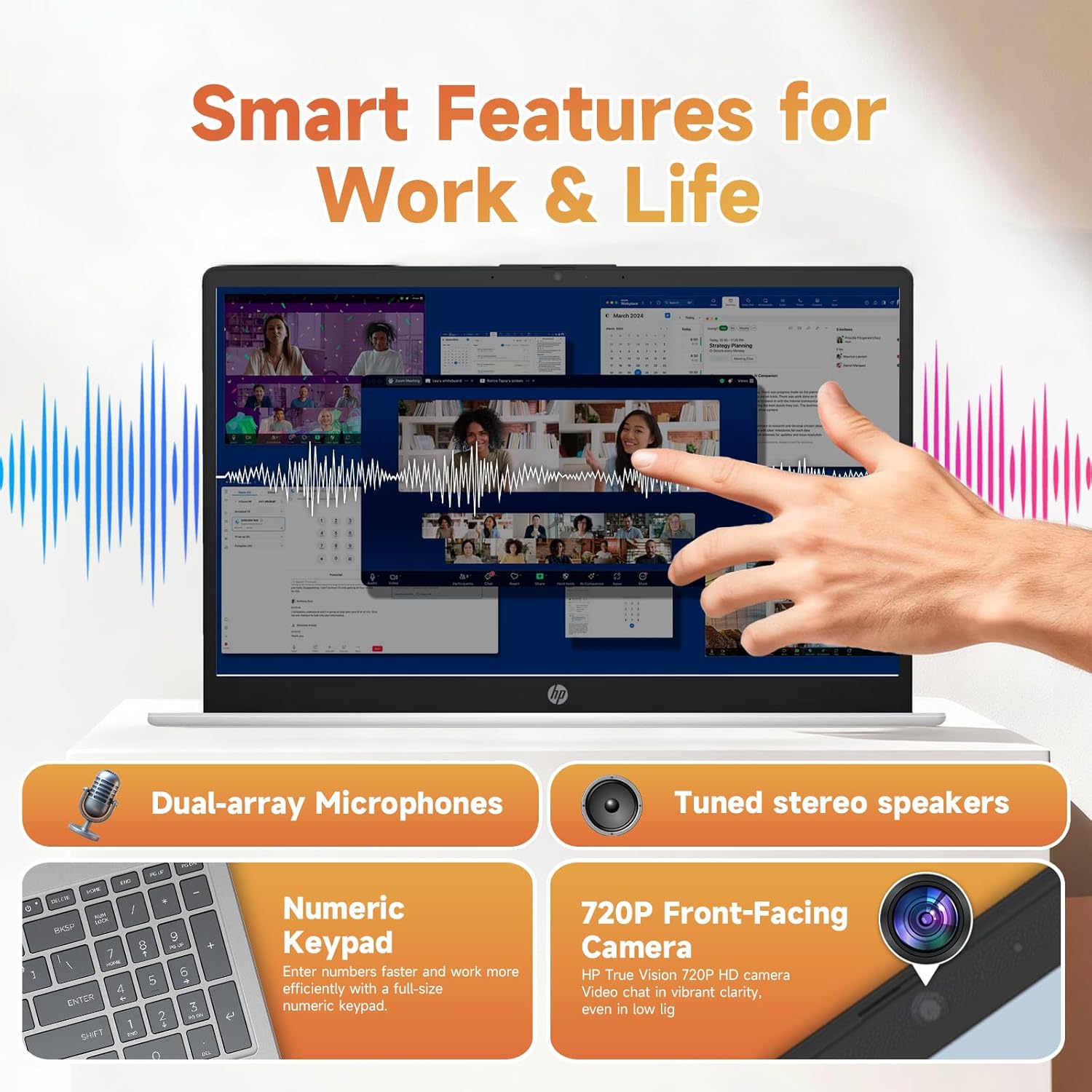 Crystal-Clear Video Calls— Look sharp and sound even better with the HP True Vision HD camera, AI-powered noise reduction, and dual-array microphones. With built-in privacy shutter and mic mute key, you’re always in control of your environment.
