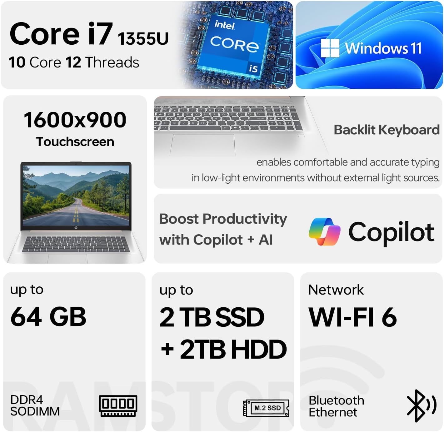 HP Essential 17t Laptop, 17.3″ HD+ Touchscreen, Intel Core i7-1355U, 64GB RAM, 1TB SSD, Webcam,…