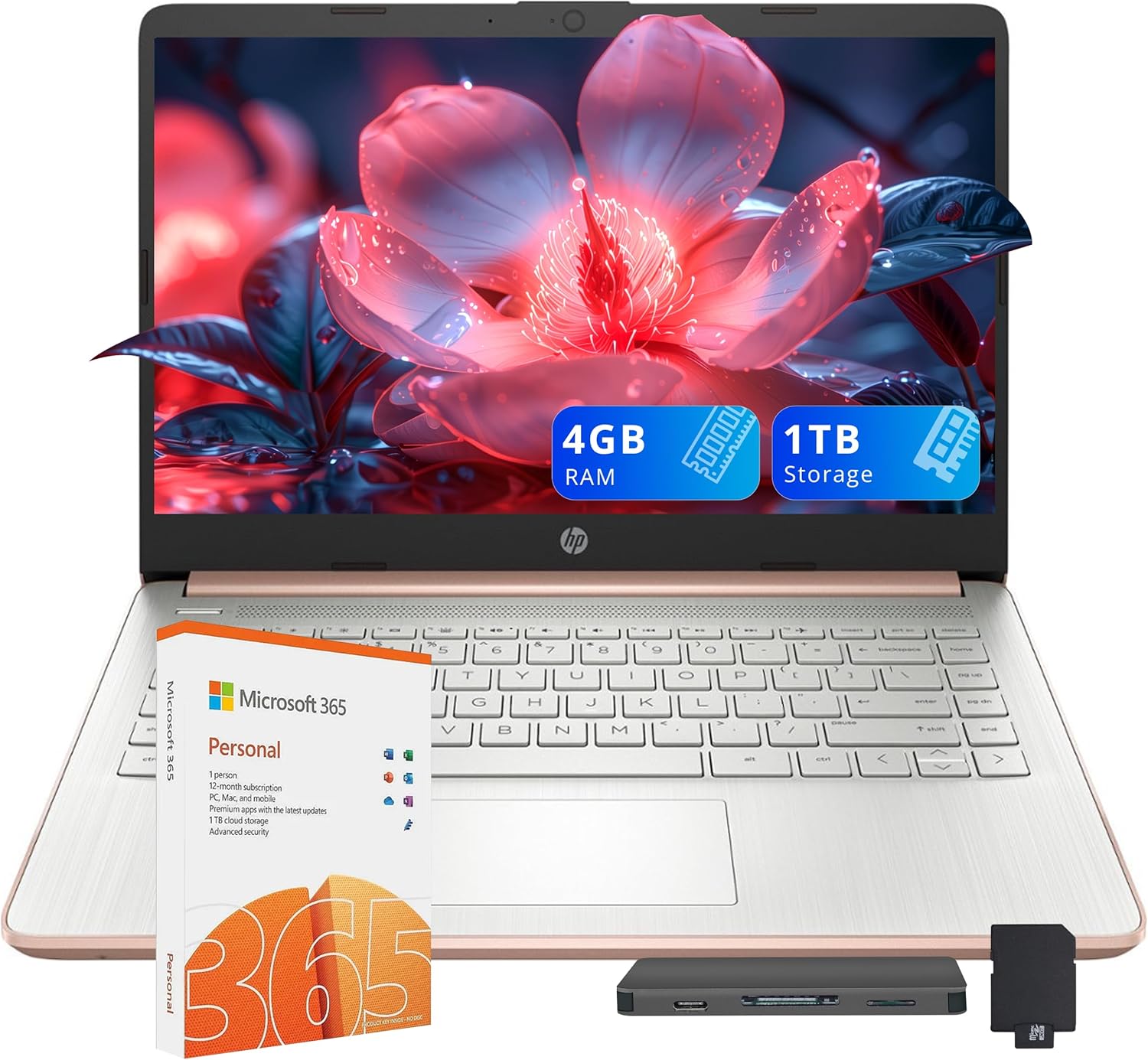 HP Stream 14″ HD Business Laptop, Intel Celeron N4120, 4GB RAM, 1TB Storage (64GB eMMC + 1TB Docking Station Set), Intel UHD Graphics, 720p Camera, Wi-Fi, 1 Year Office 365, Win 11 Home, Rose Gold