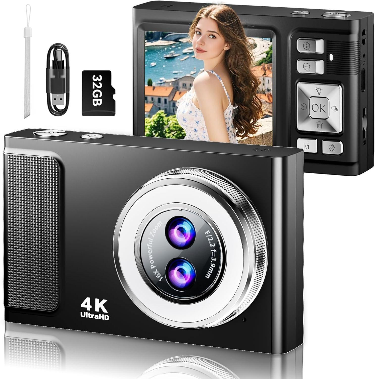 JDZ Digital Camera, 4K UHD Point and Shoot Cameras with Dual Camera, Compact Kids Digital Camera with16X Zoom Anti-Shake for Teens Boys Girls, Black