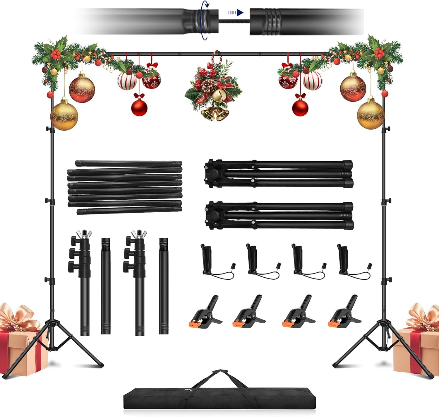 【Complete Photo Backdrop Stand Kit】The photography back drop stand includes 2 x Adjustable Folded Tripod Stand / 2 x Adjustable support rod / 4 x Fish-shaped clamp / 1 x Horizontal bar with rope / 2 x Vertical rod / 4 x Wire buckle / 1 x Black carrying bag. The entire background stand is easy to set up.