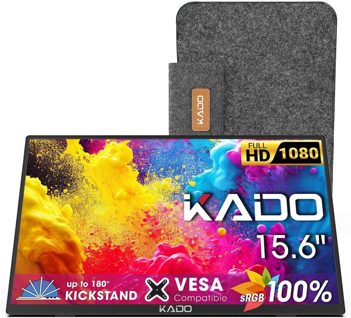 Kado Portable Monitor 15.6” 1080p, 100% sRGB USB-C HDMI Gaming Monitor Ultra-Slim Display Built-in Speakers, External Monitor 180° Kickstand Wall/Arm Mount for Laptop PC Phone Mac Xbox PS4/PS5 Switch