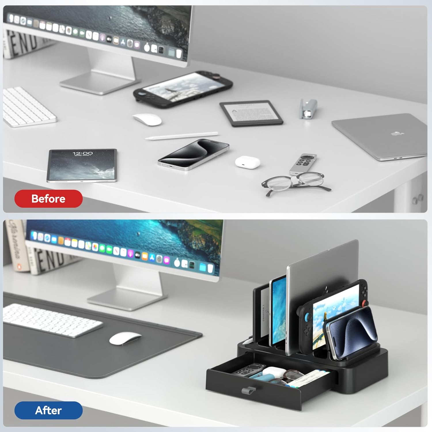 Vertical Optimization Space – This laptop vertical stand effectively reduces desktop clutter while accommodating six devices, freeing up valuable workspace on your desk and keeping it neat and organized. The upgraded vertical laptop holder with drawers brings even more convenience to your life.