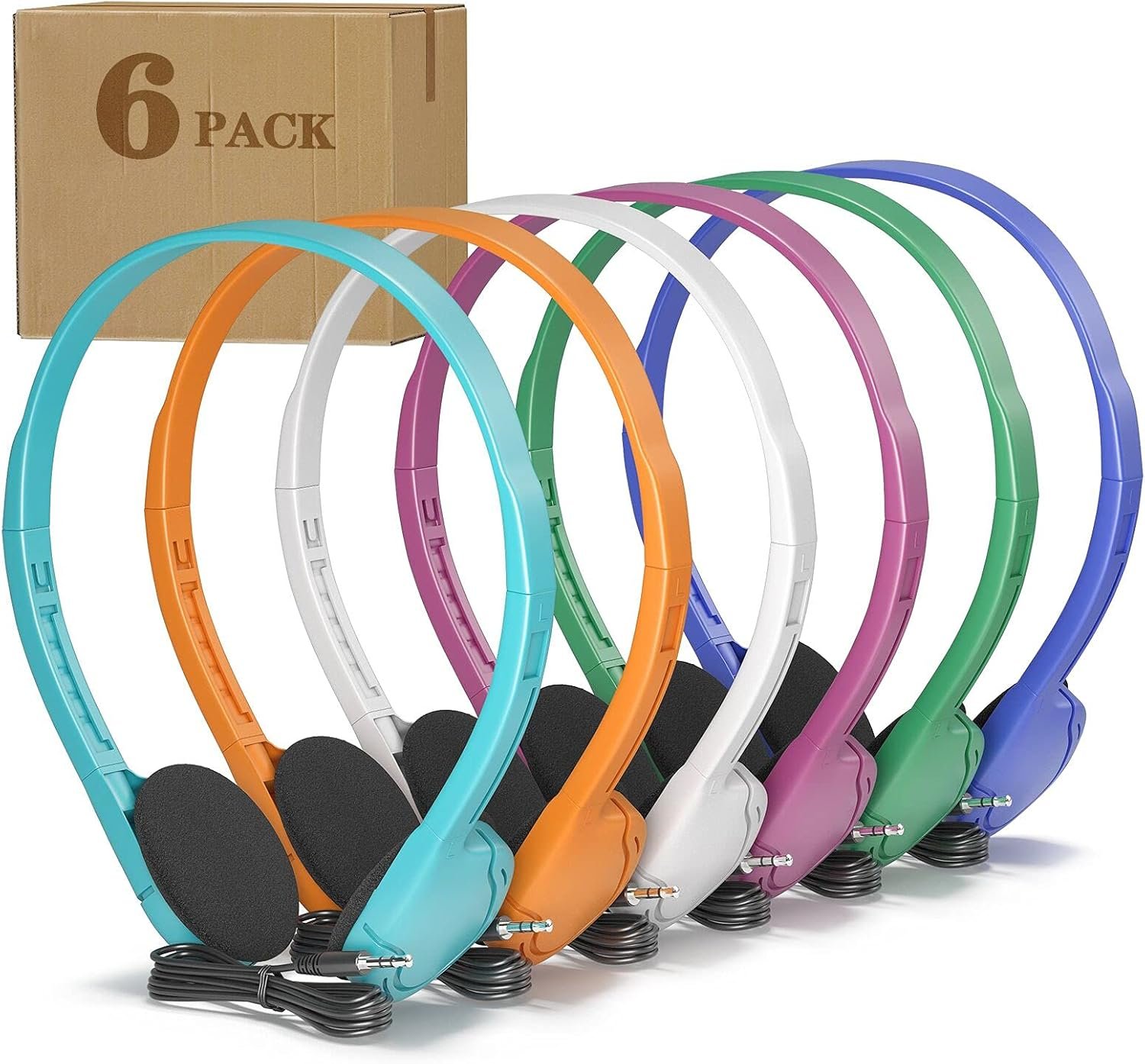 Multicolor Headphones in Bulk 6 Pack : Pack of Headphones in 6 colors mixed: Blue / White / Orange /Purple/ Green / Cyan, Each color 1 sets, each headphone individually packaged and sealed. Headphones for kids are available in a stylish and kid-friendly Bright color, which will catch the fancy of children at their first sight.