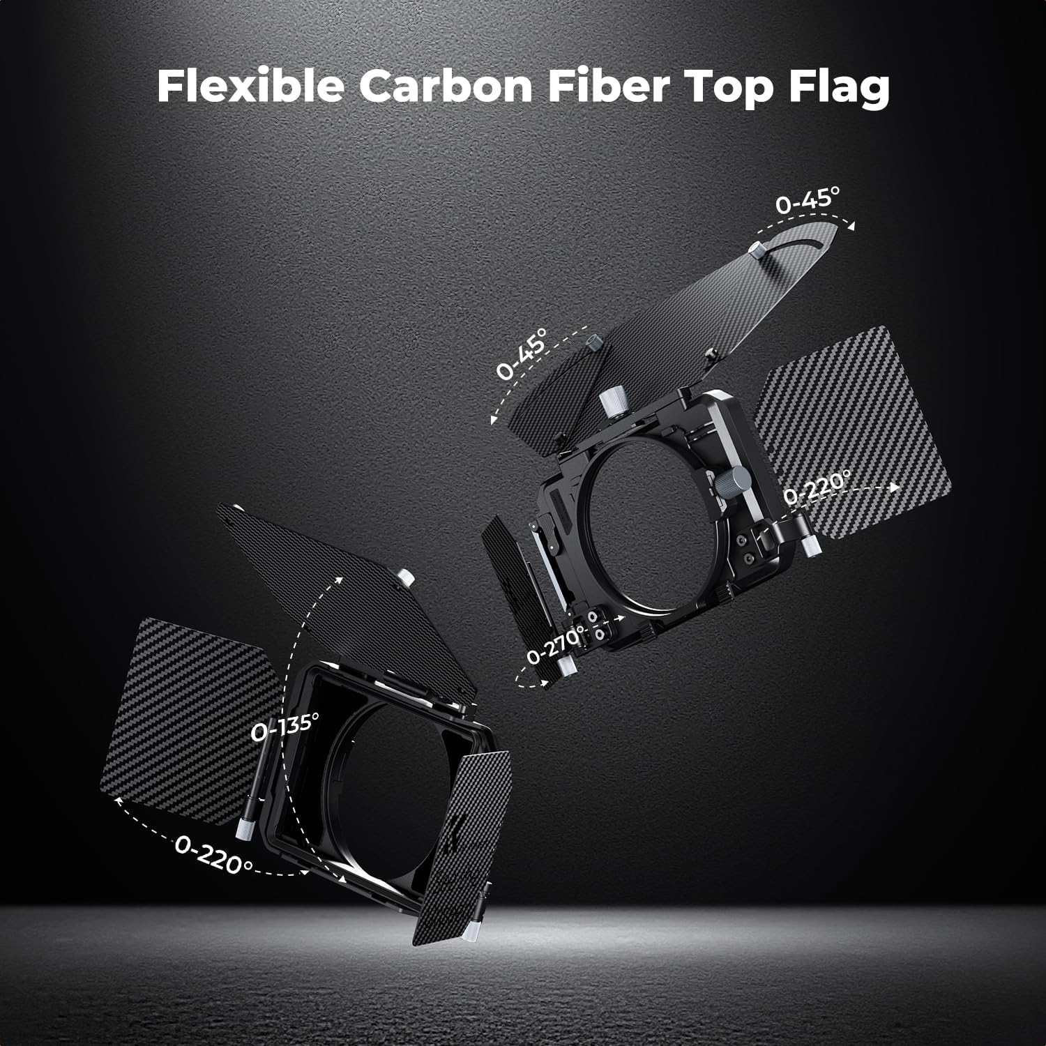 【Adjustable Carbon Fiber Flags】K&F CONCEPT Mini Matte Box Pro 3680 is designed for mirrorless cameras to prevent sunlight or other light from causing glare and flare and to control images on the screen. The top flag opens 180° and its side wings extend 40° for additional light blocking; The side flag is attached to either the matte box or the filter tray via slots and opens 180° to block stray light. Note: The top flag cannot be closed shut when more than 2 filter trays are installed