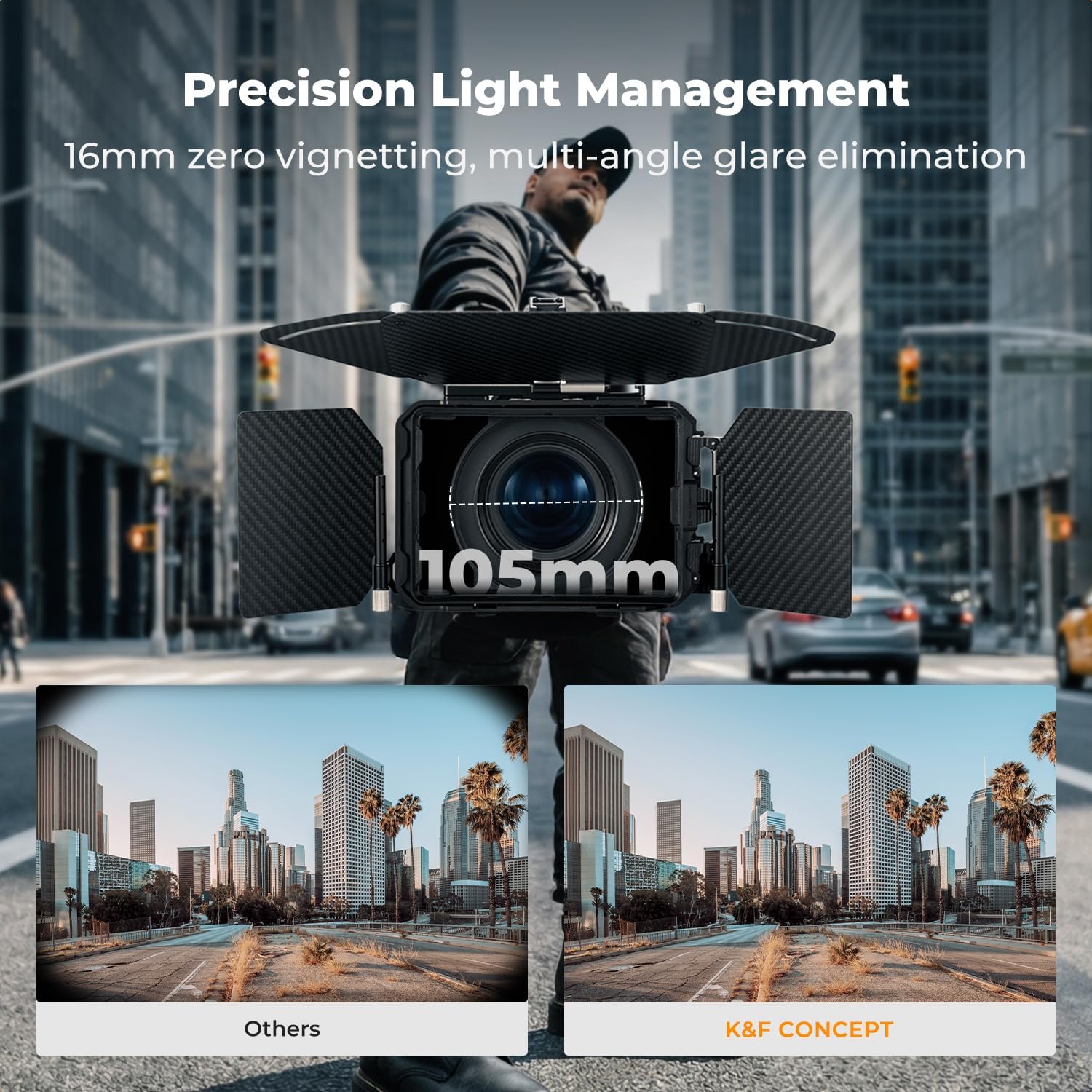 【Versatile and Secure Filter System】The matte box can hold two 4×5.65 inch filters and includes a secure locking mechanism. It supports various filter types.