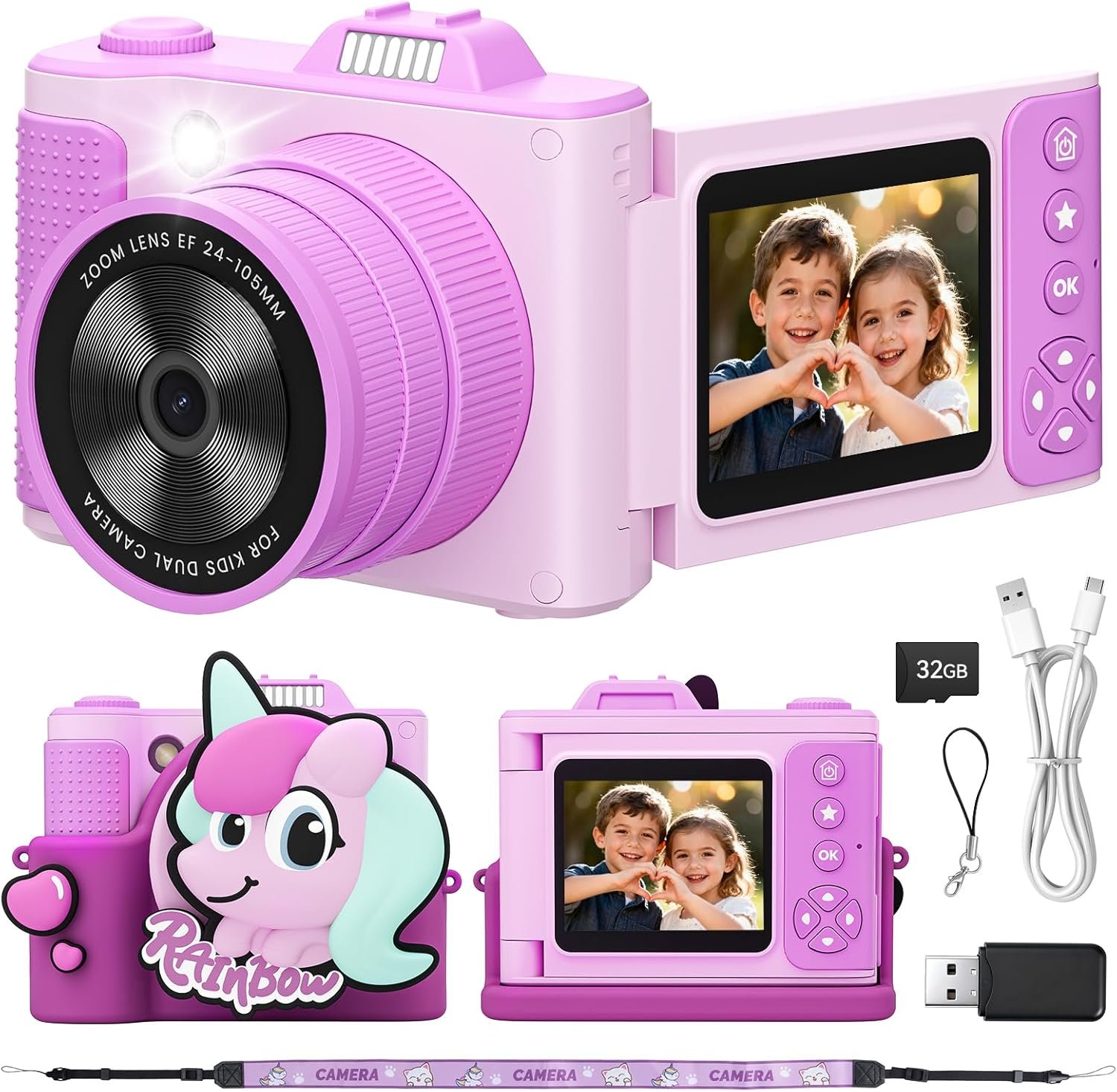 LONG-LASTING BATTERY & 32GB SD CARD:The 1000mAh rechargeable battery and 1A charging cable,ensures 2-3 hours of continuous photography. The 32GB SD card Can store thousands of pictures and videos, meeting kids’ daily needs. The included card reader can transfer photos to your computer, recording the wonderful moments of your child’s growth.