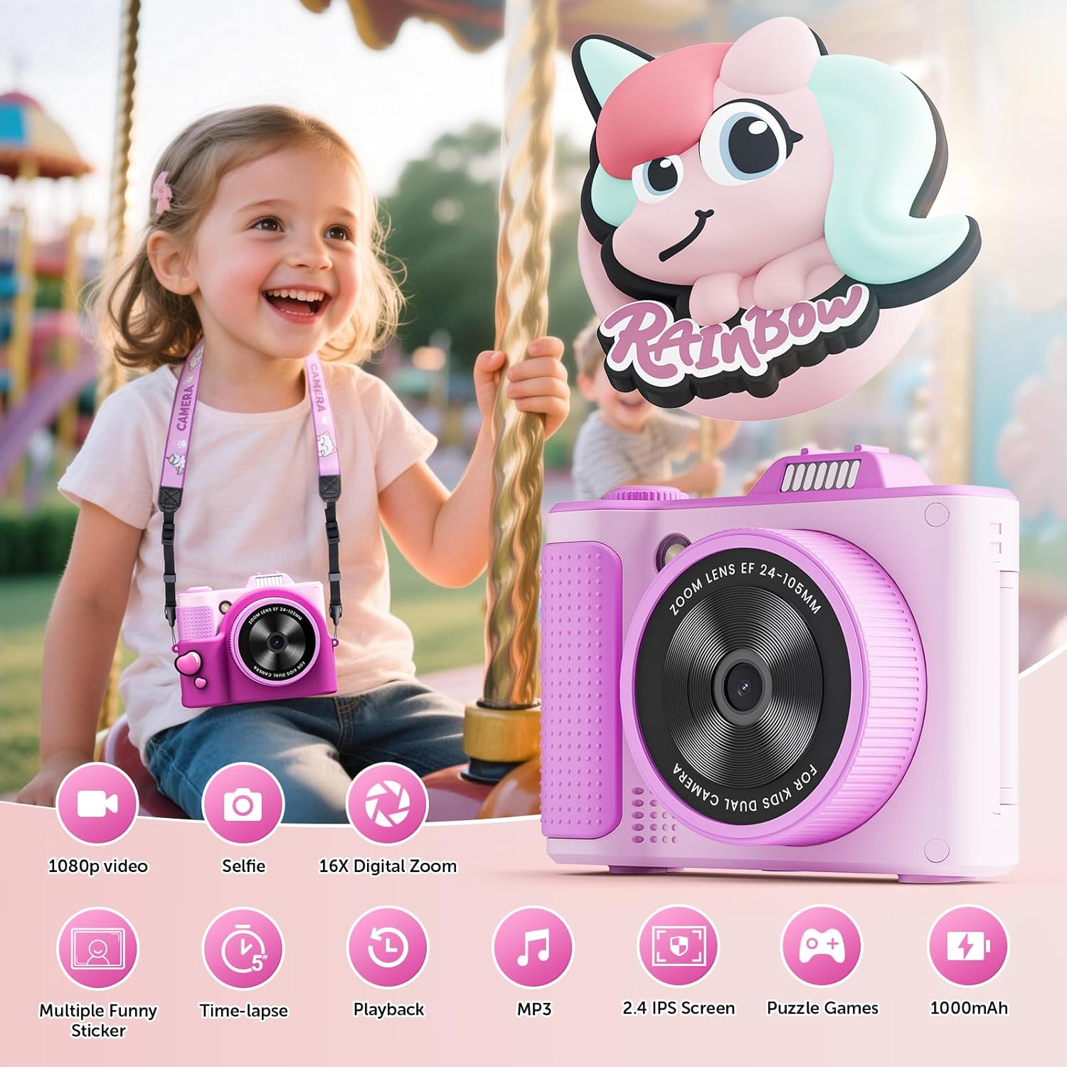 MULTI-FUNCTIONAL CAMERA FOR KIDS:Packed with fun features, MP3 music player, 3 puzzle games,Video recording and playback,13 photo frames, 9 filters, burst shooting, and Time-lapse shots. Let your child unleash their creativity with this multi-functional kids camcorder, ideal for capturing special moments, experimenting with photography.MULTI-FUNCTIONAL CAMERA FOR KIDS:Packed with fun features, MP3 music player, 3 puzzle games,Video recording and playback,13 photo frames, 9 filters, burst shooting, and Time-lapse shots. Let your child unleash their creativity with this multi-functional kids camcorder, ideal for capturing special moments, experimenting with photography.
