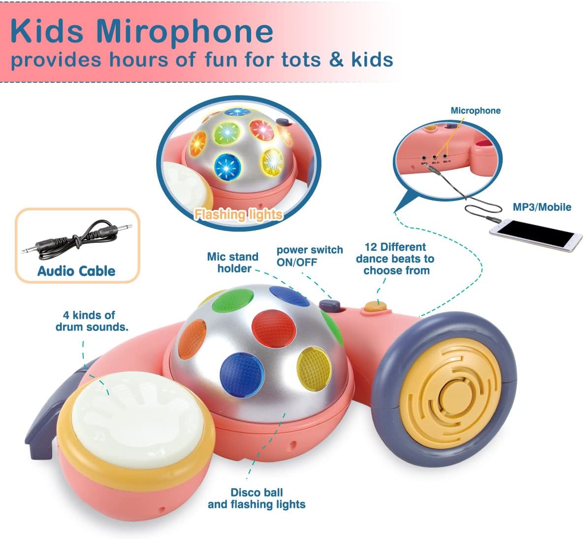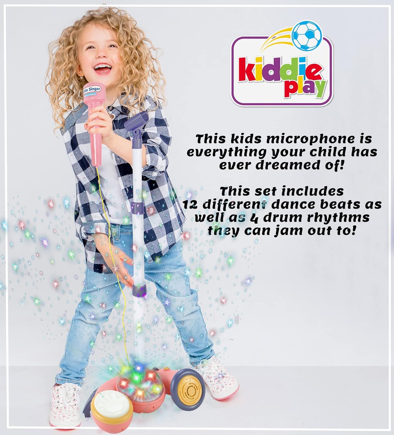 MICROPHONE STAND FOR KIDS – This kids microphone is everything your child has ever dreamed of! This set includes 12 different dance beats as well as 4 drum rhythms they can jam out to!