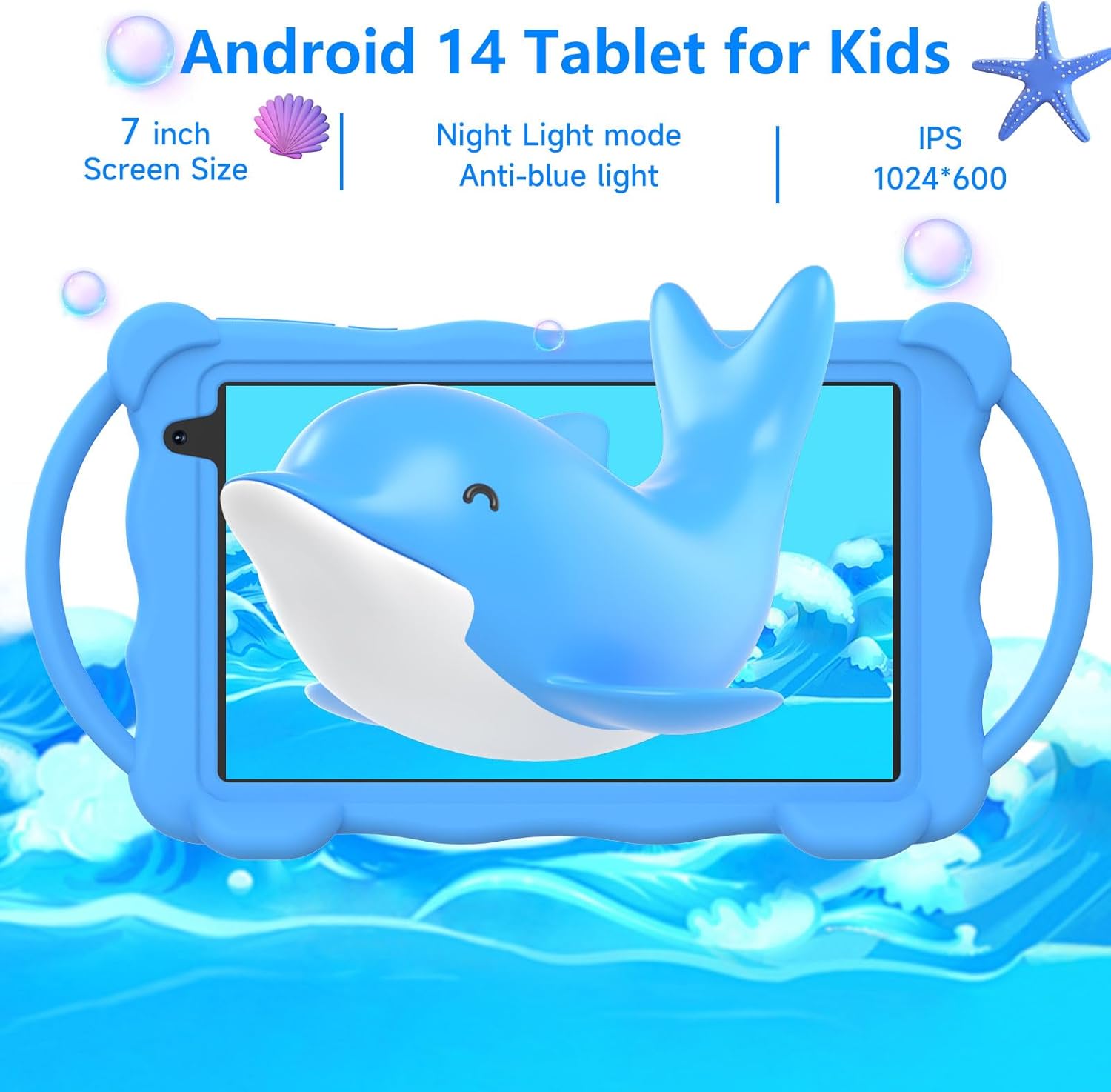 Kids Tablet 7 inch Android 14.0 for Toddler, 4GB RAM 32GB ROM Bluetooth IPS Screen Google Play YouTube Parental Control Dual Camera Shockproof Case for Educational Games (Blue)