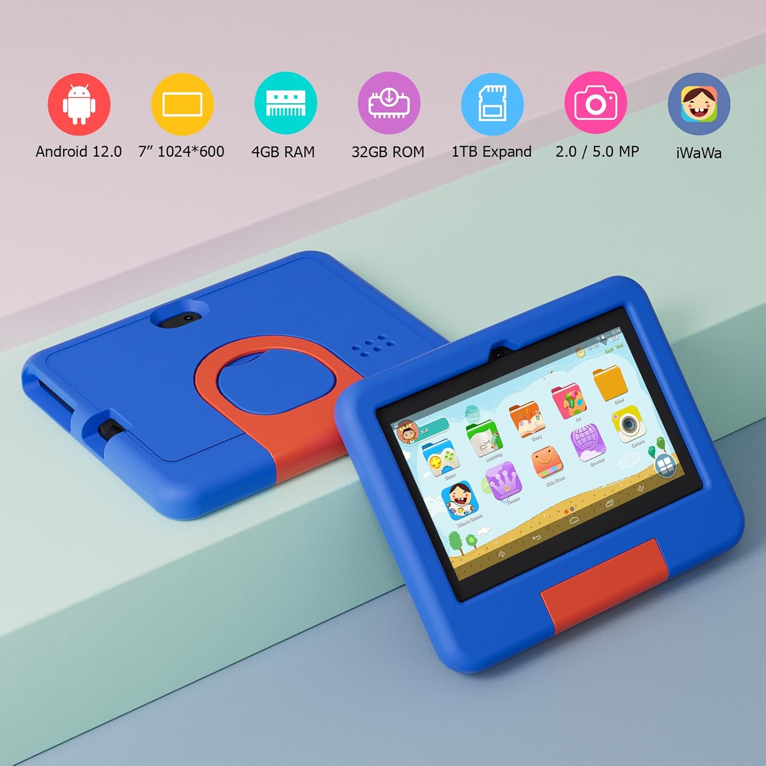 Kids Tablet, 7 inch Android Tablet for Kids, 4GB RAM 32GB ROM 1TB Expand, Toddler Tablets with Parental Control, IPS Screen, Dual Camera, Educational, Games, Shockproof Case for Boys/Girls (Blue)