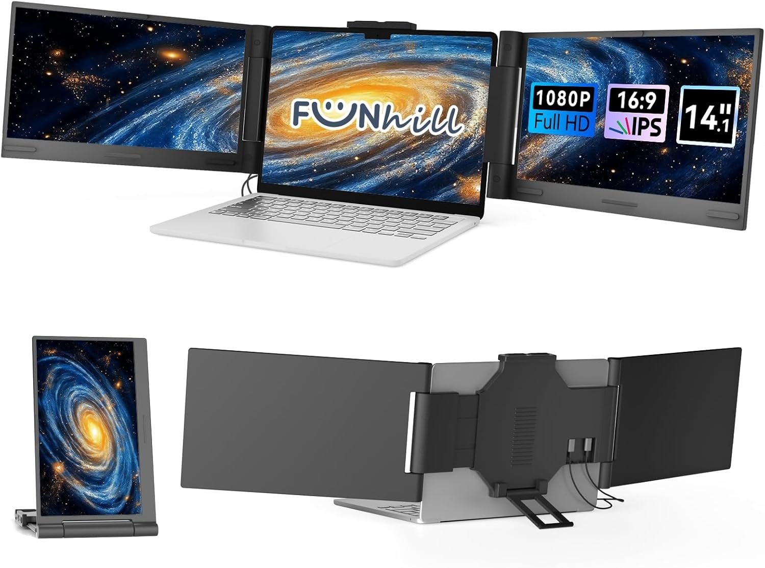 Boost 300% Efficiency- Funhill laptop screen extender can instantly expand your laptop to triple screens – view spreadsheets, design tools, and chats simultaneously. Say goodbye to the hassle of constantly switching back and forth on a single display continuously. Portable screen for laptop can switch between extended/duplicate/portrait modes to minimize tab-switching fatigue. Funhill triple monitor provides the perfect solution for laptop users for multi-screen synchronization and split-screen display.