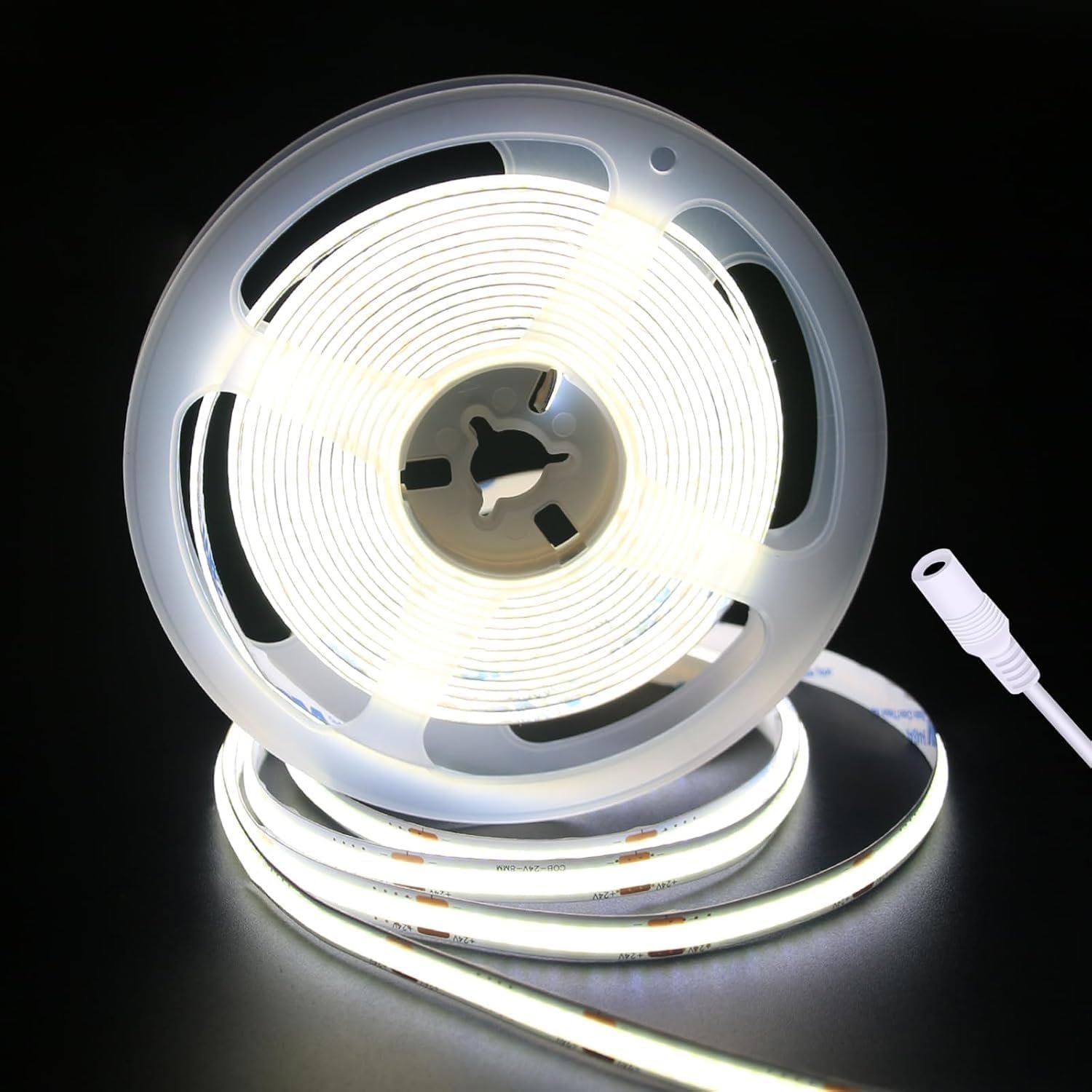 High Density and Super Brightness: Utilizes COB technology with 320 LEDs per meter (1600 LEDs total for 5 meters), delivering 14W/m power for brilliant and uniform White 6000K light