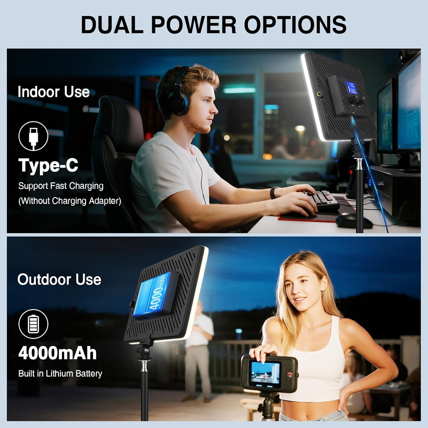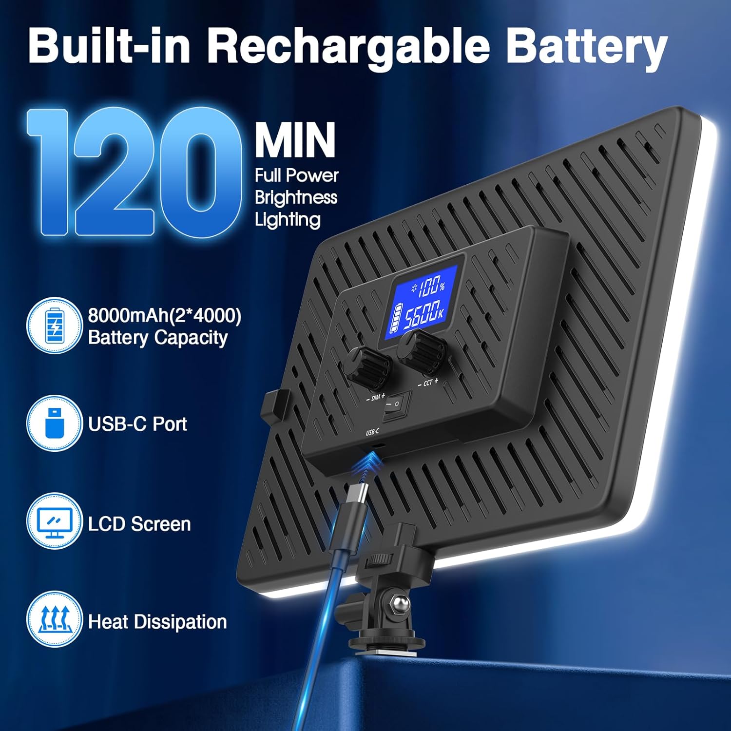 【Fast charge, High Capactiy battery】This lighting panel is the built-in 4000mAh/7.4V battery in each LED video light. At full brightness, it lasted for around 120 minutes. Charging about 3.2 hours via USB-C cable. Allowing you to position the lights freely without being tethered to power outlets.