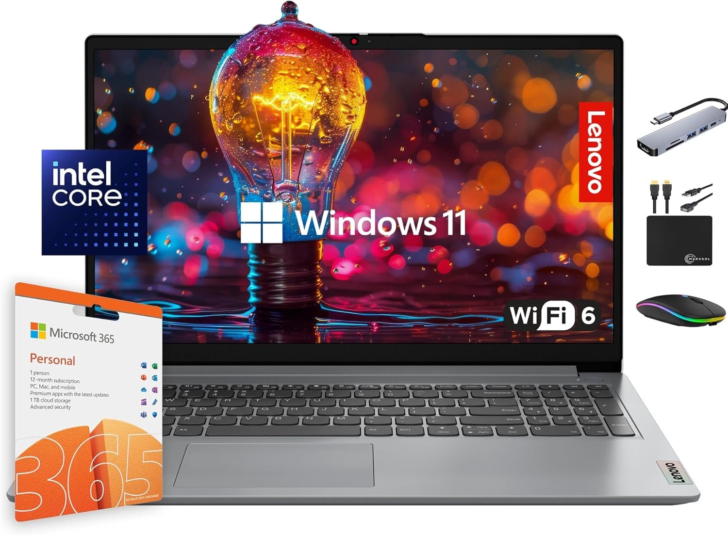 Lenovo IdeaPad Laptop Computer 2025, 15.6″ Display, 12GB RAM, 1.1TB Storage (500GB SSD + 128GB eMMC + 500GB Ext), Intel Dual Core Processor, Long Battery, MarxsolAccessory, 1 Year Office 365, Win 11