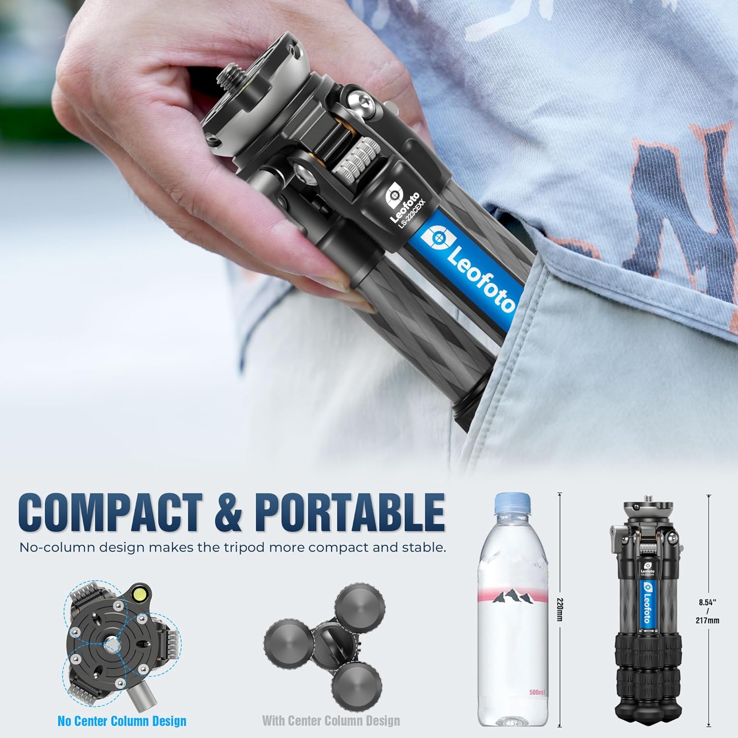 Compact & Portable: No-column design makes the tripod more compact and stable. Semi-automatic angle stop quickly adjusts the angle of opening, the tripod can be opened at 23°, 55° and 85°. Quickly unfolds with a quarter-turn using the standard twist leg locking system. Folded height is only 8.54 inches/217 mm, weight is only 1.34 lbs/0.61 kg, easy to carry