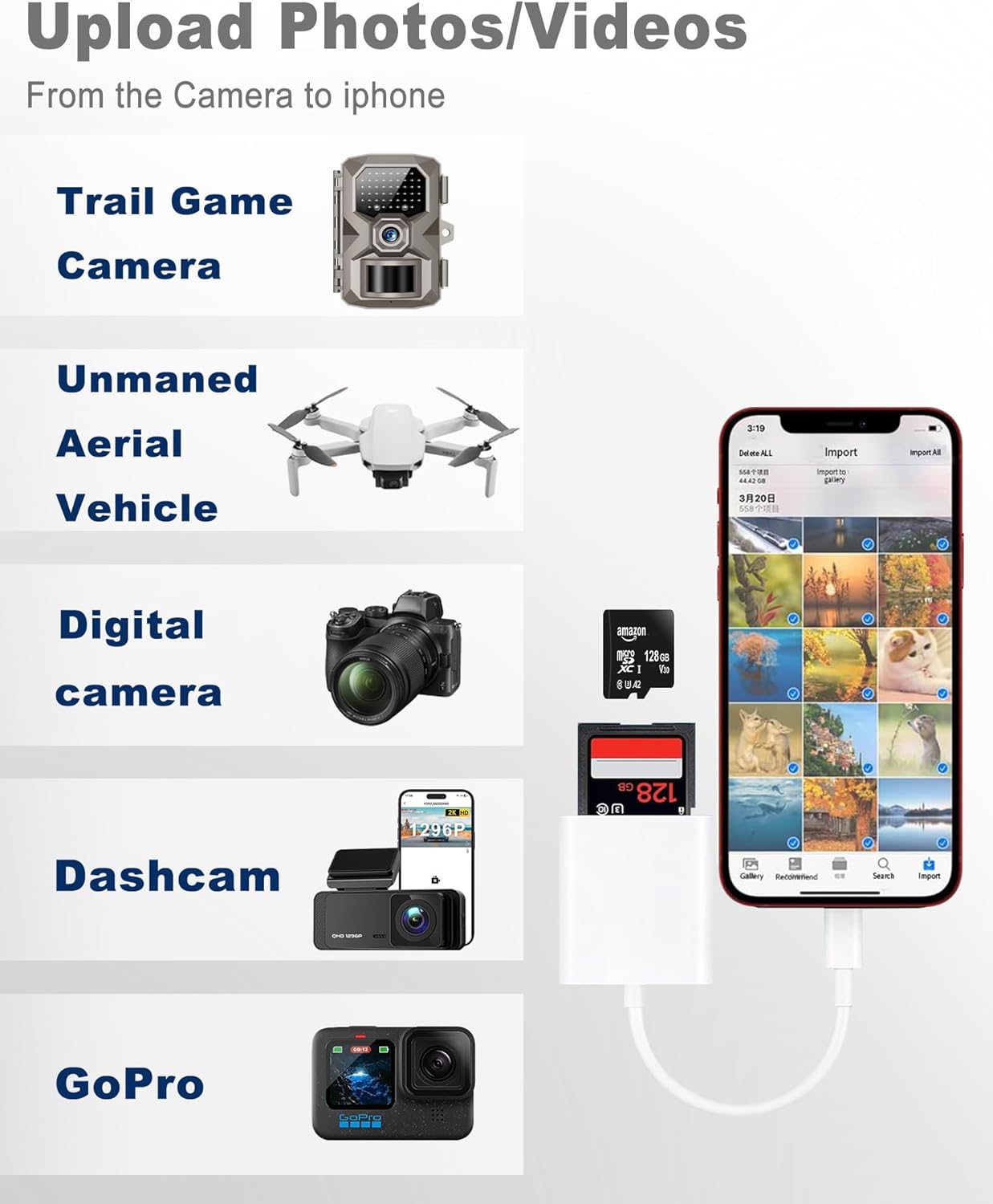【Formats and Capacity Support】:The lightning to memory card Converter supports standard photo formats (including JEPG and RAW) and SD and HD video formats (including H.264 and MEPG-4). supports sd cards from Digital Camera, Sports Camera, Drone, Trail game Camera. This SD card to Phone adapter allows you to share the great moments to social media in real time