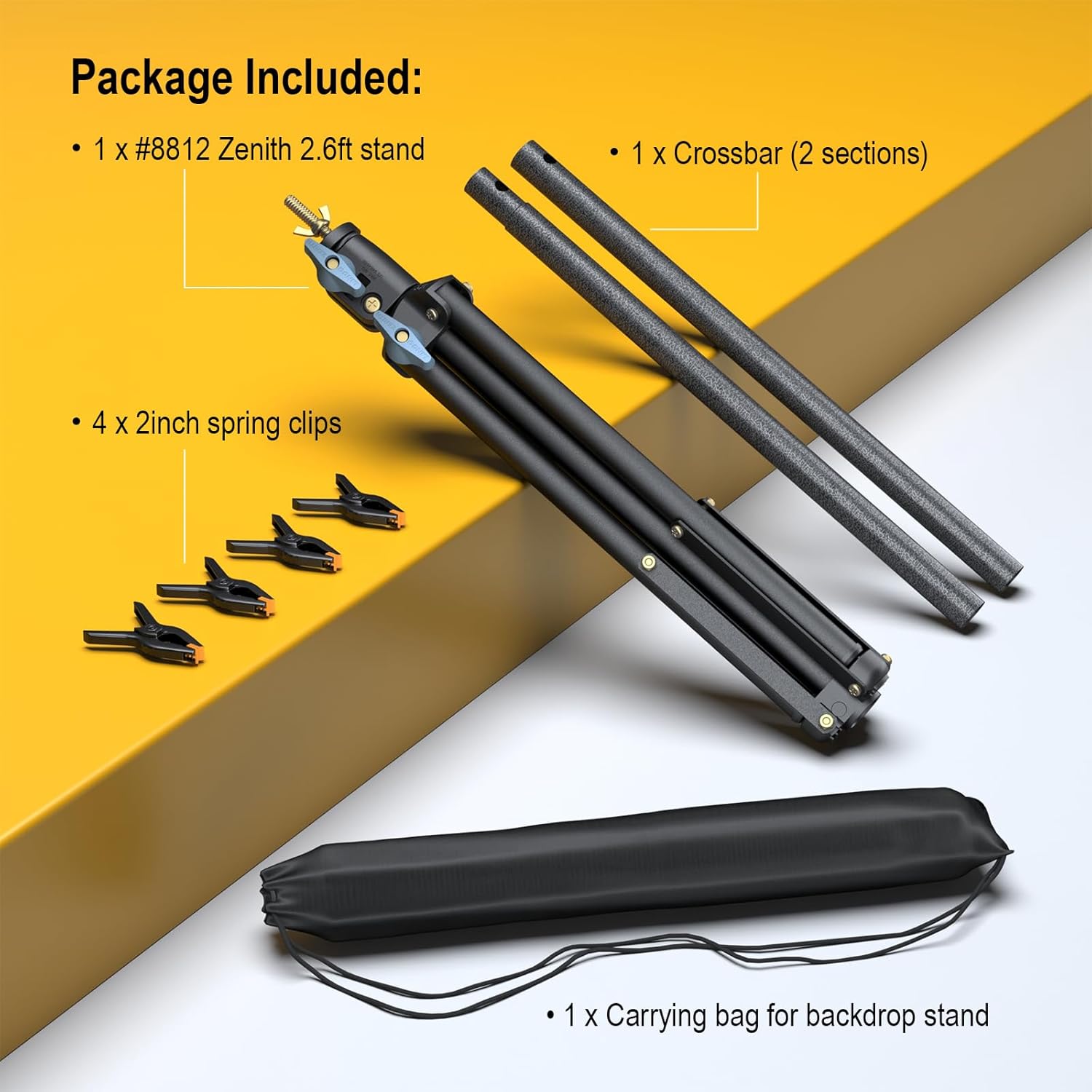 PACKAGE: 1x #8812 Zenith 2.6feet backdrop stand, 1x Crossbar of 2 Sections, 4x 2inch strong spring clamps, 1xCarrying Bag
