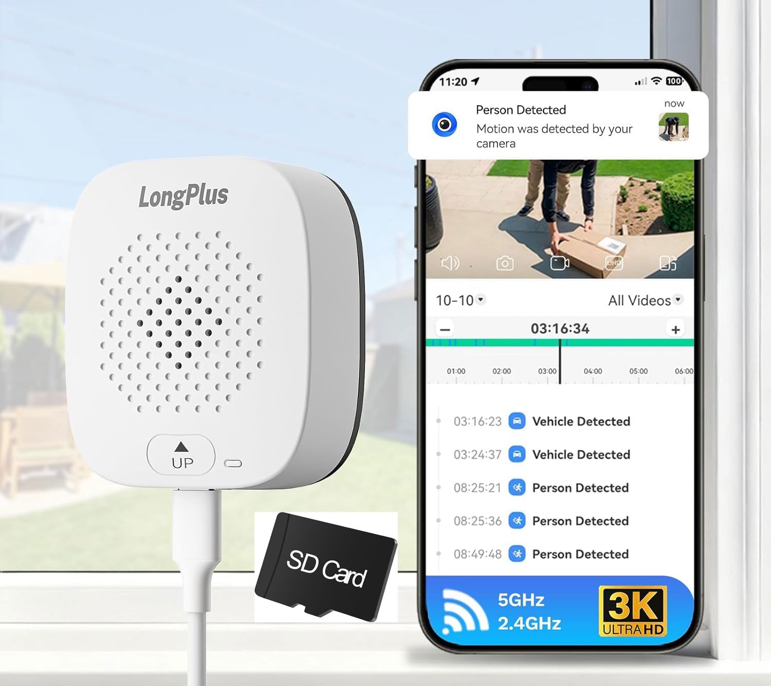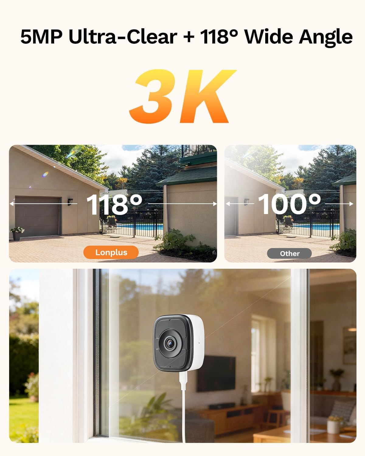 【Person/Vehicle Detection & Real-Time Alerts】 Stay secure with LongPlus indoor safeview window security cameras. This stick on window camera wireless uses AI detection system to smartly identify people and vehicles. When motion is detected, it sends instant alerts to your phone, allowing you to promptly check the live feed. With 5MP HD resolution and a 118° wide-angle lens, it clearly captures faces and license plates across a broad area.