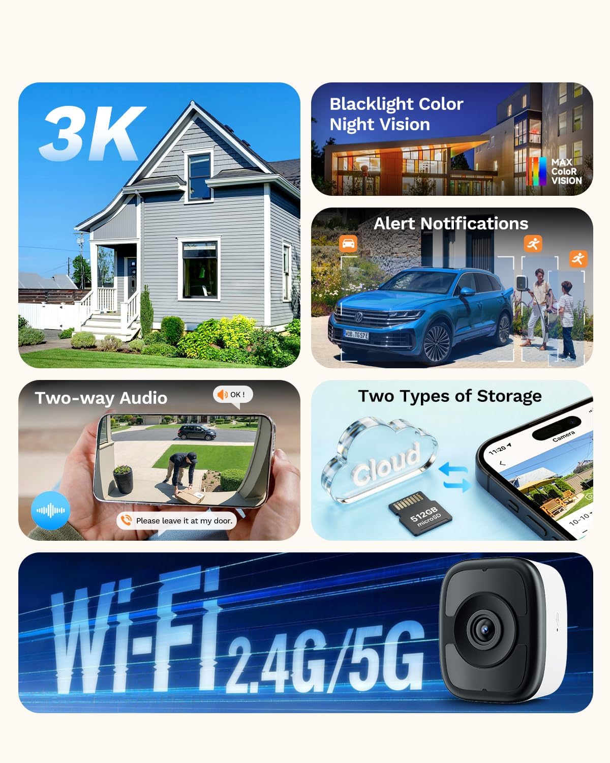 【24/7 Recording & Flexible Storage】 This wireless windows camera for home supports 24/7 continuous recording (requires SD card or cloud subscription). Choose your storage method: local storage with an SD card (sold separately) or use optional U.S. cloud storage (indluded 64GB). New users enjoy a 30-day free trial of the cloud service.
