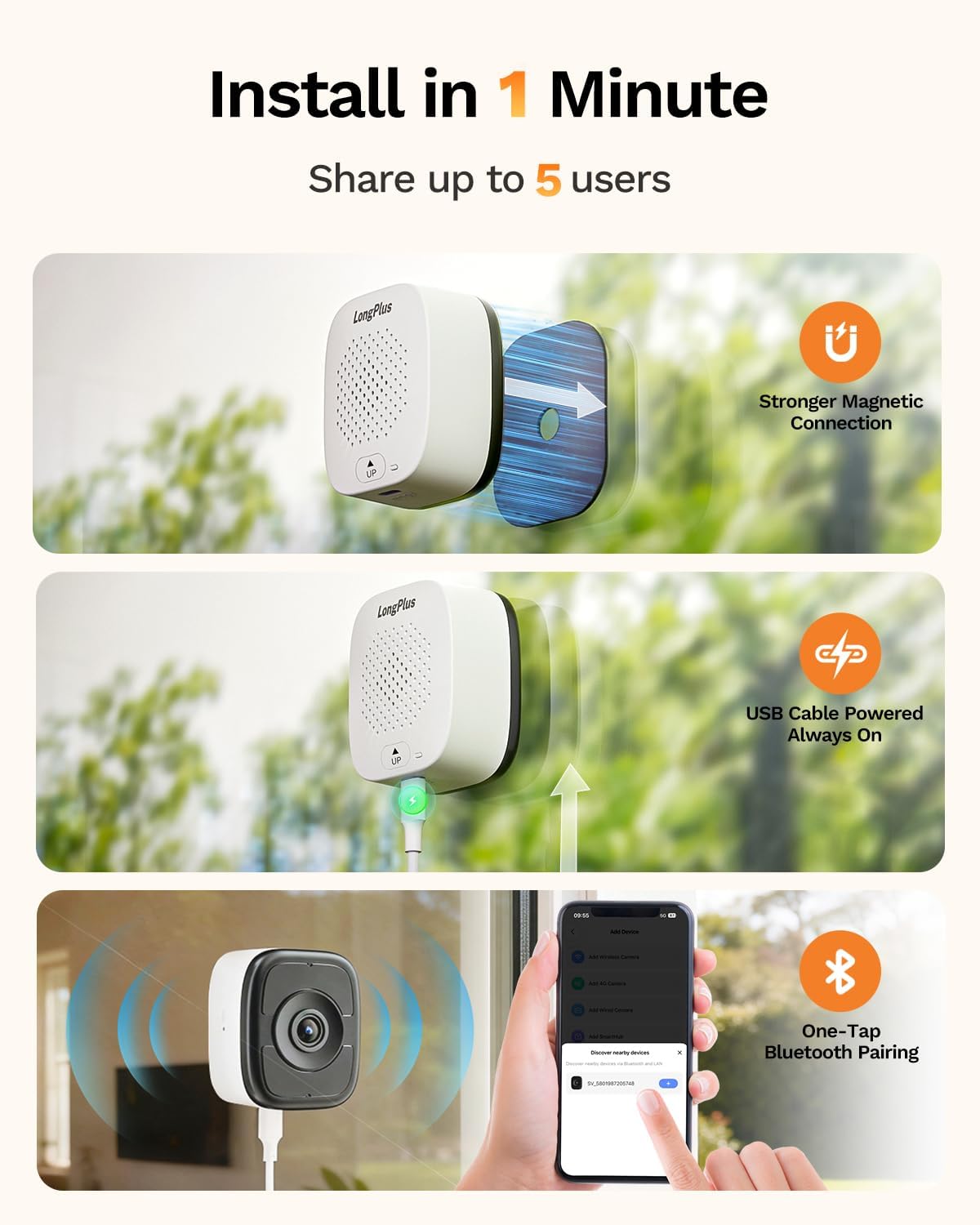 【Quick Install & Dual-Band Wi-Fi】 Featuring a peel-and-stick mount and one-click bluetooth pairing, LongPlus window mounted security cameras can be easily installed on any smooth surface like glass. This window security camera through glass supports both 2.4GHz & 5GHz dual-band Wi-Fi, offering a seamless connectivity experience. This makes it an ideal solution for renters and all users.