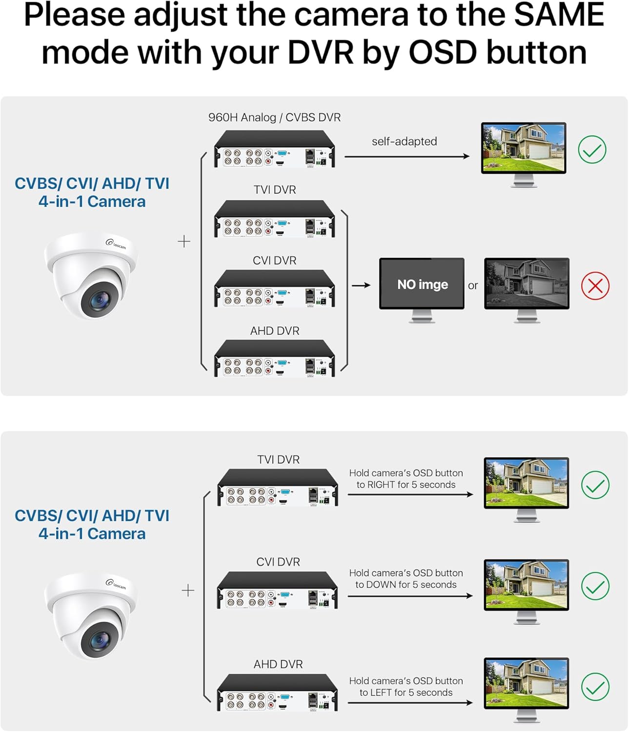 Simple OSD Mode Switch & Plug-and-Play Setup – Loocam 4 in 1 security cameras switching video outputs is incredibly straightforward. Simply press the OSD joystick on the cable for 5 seconds to cycle between AHD, TVI, CVI, or CVBS modes, then synchronize with your DVR’s settings. This user-friendly design ensures a hassle-free setup process, getting your system online in minutes